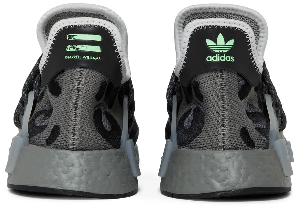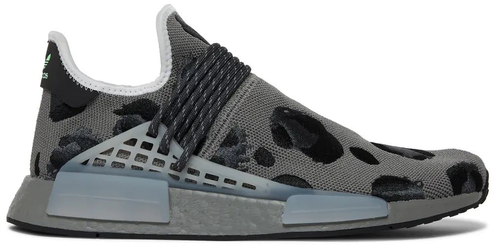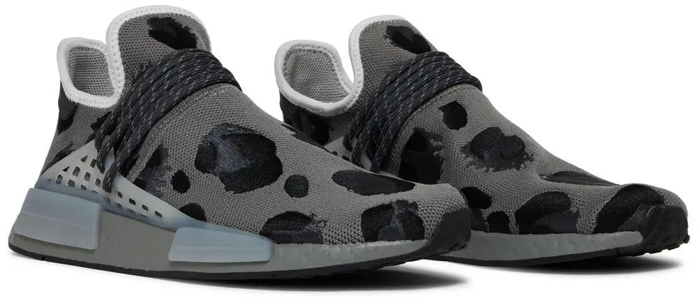 Launching as part of the ‘Animal Print’ pack, the Pharrell x adidas NMD Human Race ‘Ash’ gives the minimalist silhouette a neutral makeover. Rope laces secure a grey Primeknit upper marked with embroidered leopard spots. Mint green accents land on mismatched heel tabs in black synthetic nubuck, featuring an adidas Trefoil on the right shoe and Pharrell’s equal sign logo on the left. A semi-translucent TPU cage provides midfoot stability, while a matching grey Boost midsole offers responsive cushioning with every step.