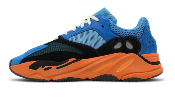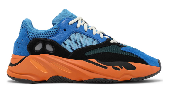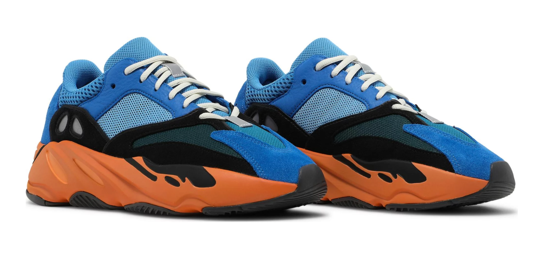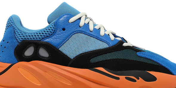 The adidas Yeezy Boost 700 ‘Bright Blue’ uses sharply contrasting finishes to delineate the lifestyle runner’s upper and tooling. The latter pairs sculpted orange sidewalls with a contrasting black rubber outsole, featuring a herringbone traction pattern with cut-out detailing that reveals a drop-in Boost midsole. Up top, royal blue mesh is reinforced with tonal suede overlays at the toe and heel, along with black suede midfoot panels enlivened with reflective detailing.