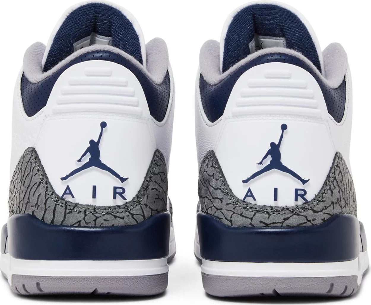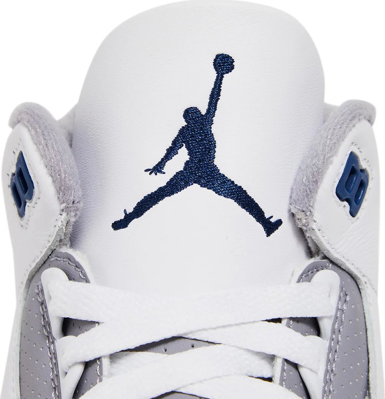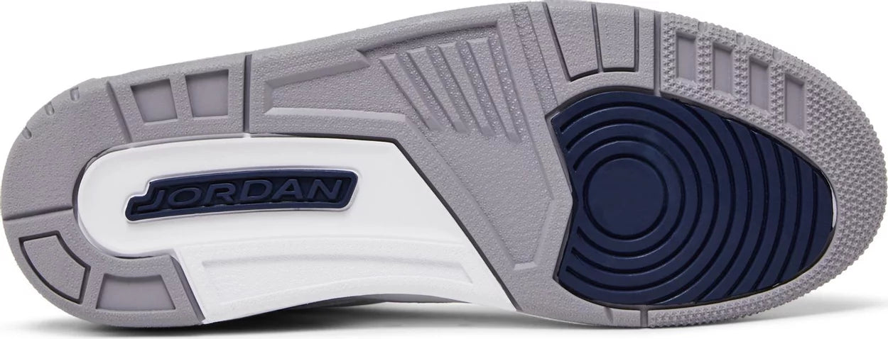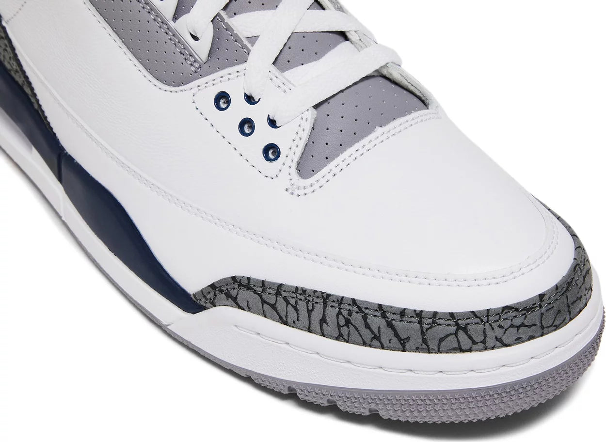 The Air Jordan 3 Retro ‘Midnight Navy’ features OG-inspired color blocking that recalls the iconic ‘White Cement’ colorway from 1988. The classic silhouette dons a white tumbled leather upper, bolstered with the shoe’s iconic elephant-print overlays at the forefoot and heel. A Jumpman logo in Midnight Navy embellishes the tongue and molded back tab. The mid-top rides on an Air-assisted polyurethane midsole, finished in white with a contrasting splash of navy at the heel.