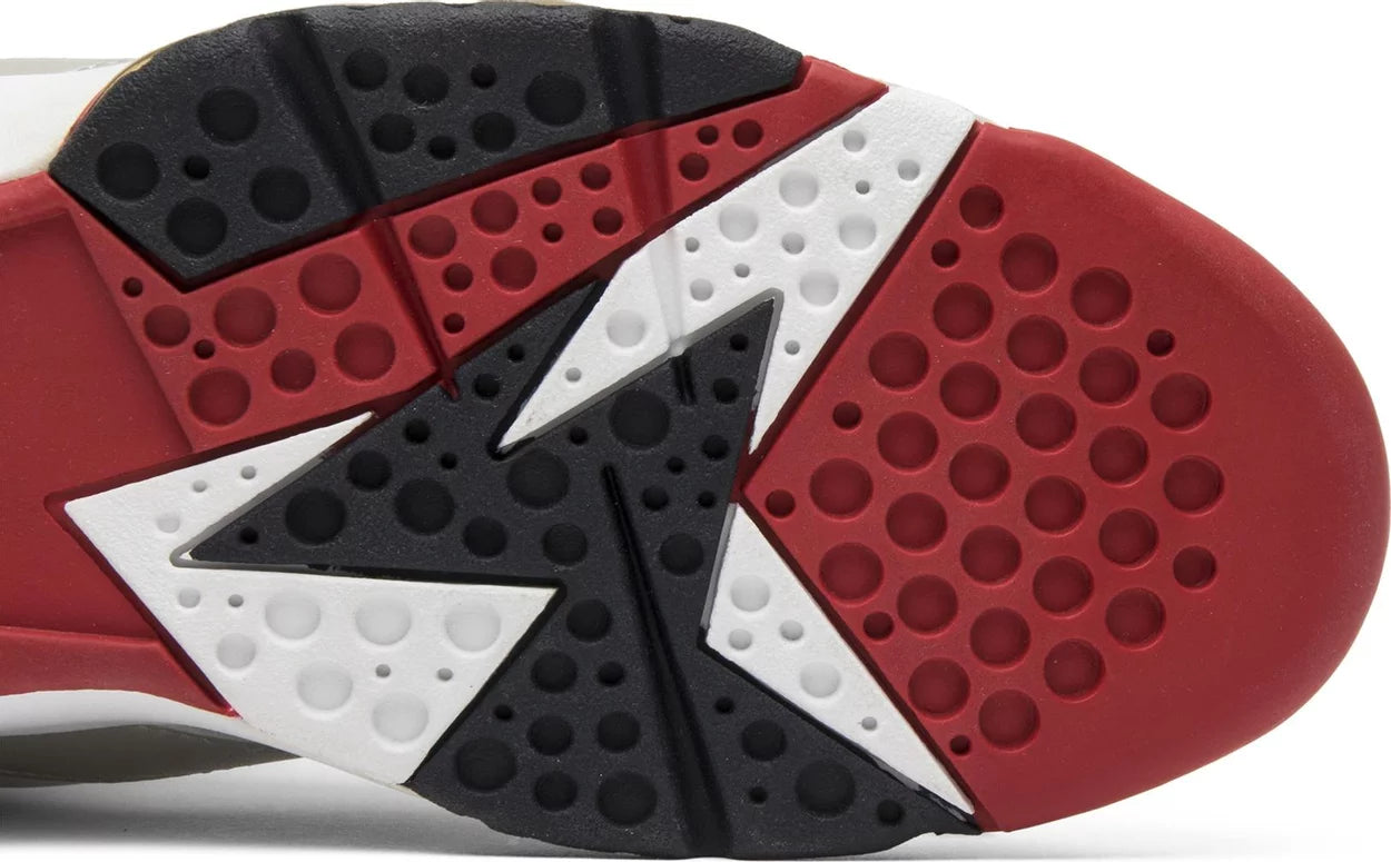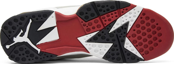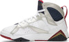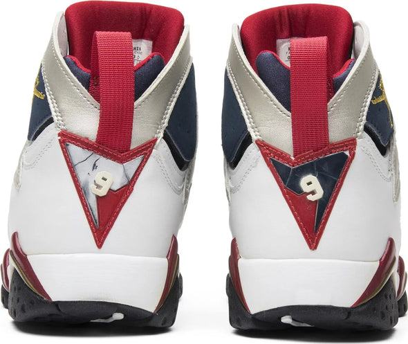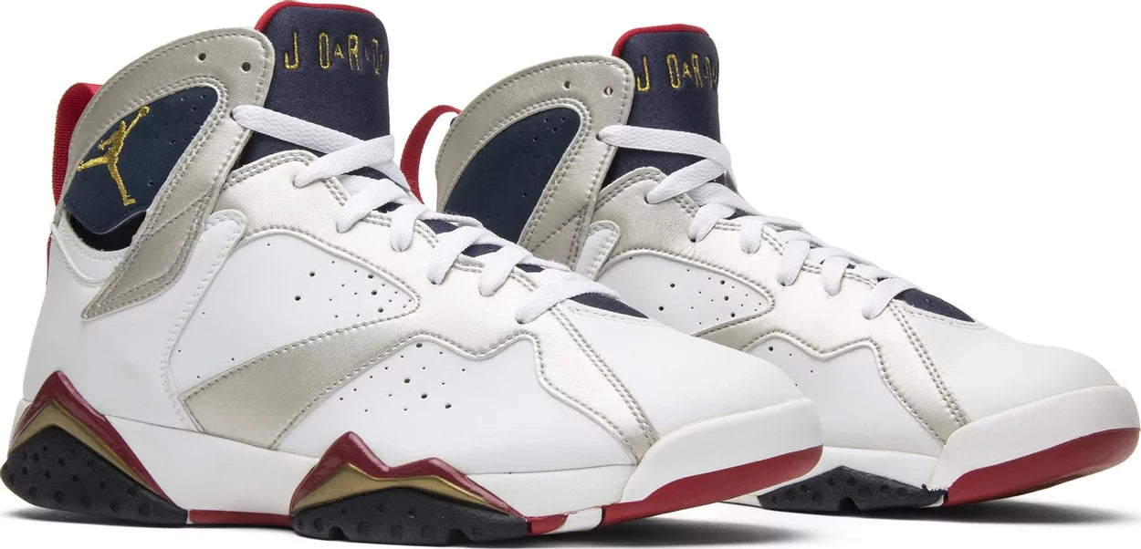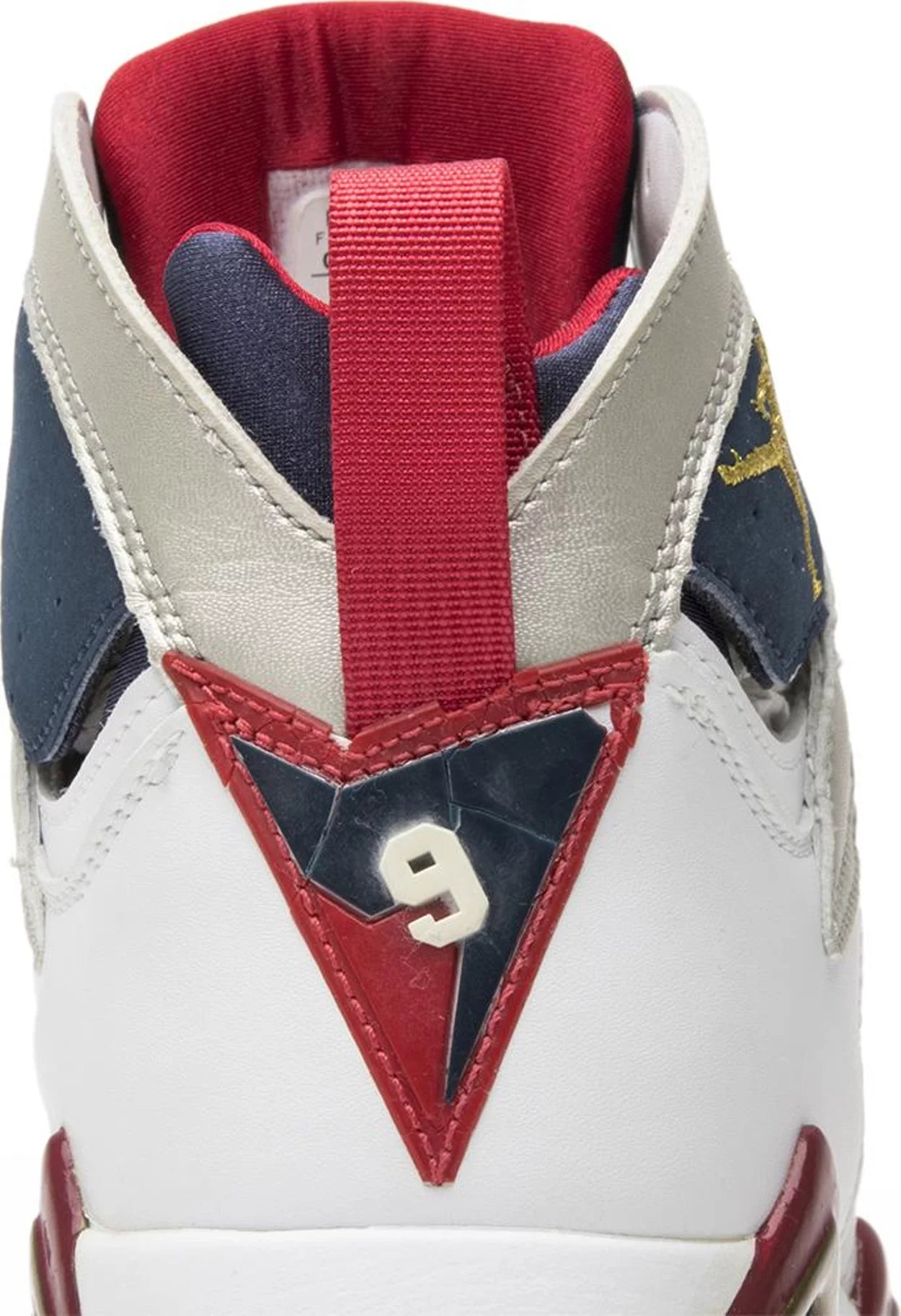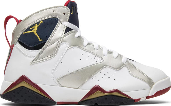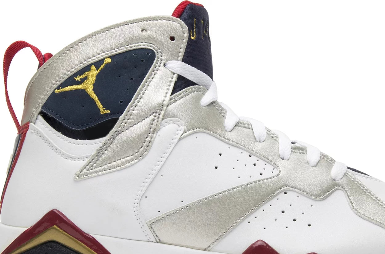 The Nike Air Jordan 7 Retro 'Olympic' 2012 is a retro re-release of the shoe worn by Michael Jordan en route to a gold medal with the Dream Team at the 1992 Olympic Games. The design features a white and metallic silver upper with Obsidian, metallic gold, and True Red accents. Released in July 2012, the sneaker also includes Jordan's Olympic jersey number '9' on the heel. Originally retro-released in 2004, the 'Olympic' also dropped in a 2016 'Tinker Alternate' colorway combining a white/navy upper with a speckled midsole.