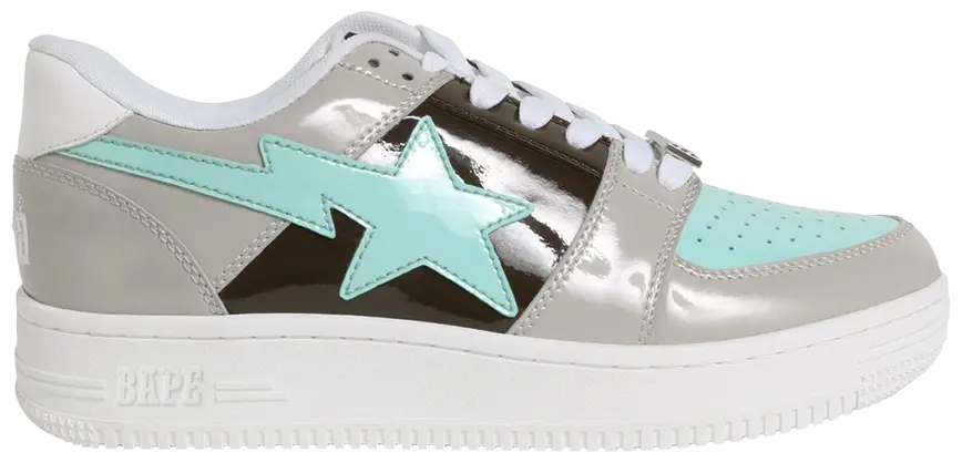 This 'Light Teal Tan' take on the color-blocked icon was one of several new Bapestas released in April 2019. The shoe features a patent leather upper with neutral tones to play off brilliant flashes of teal on the shooting star panel and toe box. This edition includes a custom lace lock for heightened brand awareness and a premium feel. Its white foam sole includes 'Bape' branding and is finished with ridged tread.