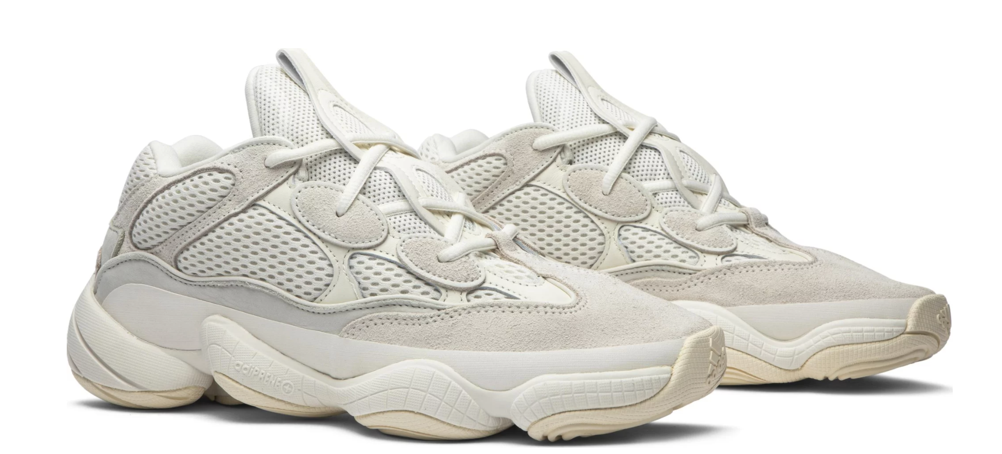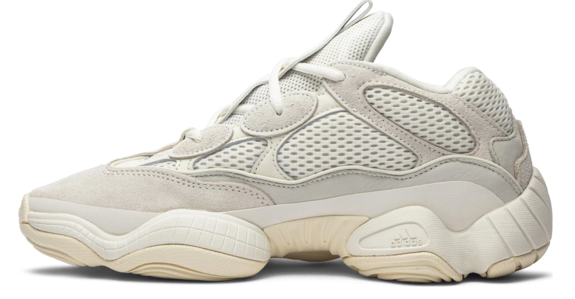 Kanye West and adidas revisit the Yeezy 500, this time in a 'Bone White' colorway. This August 2019 edition follows the silhouette's established, chunky silhouette with a cow suede, premium leather and mesh upper in Off-White tones. As in colorways past, this edition includes reflective piping details and the unmistakable, retro basketball midsole design. adidas adiPRENE+ cushioning pairs underfoot with contoured rubber pods to promote traction.