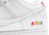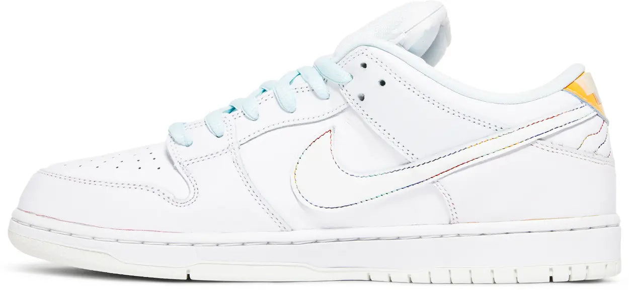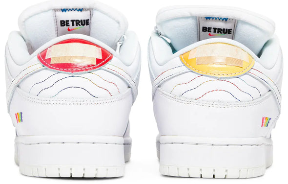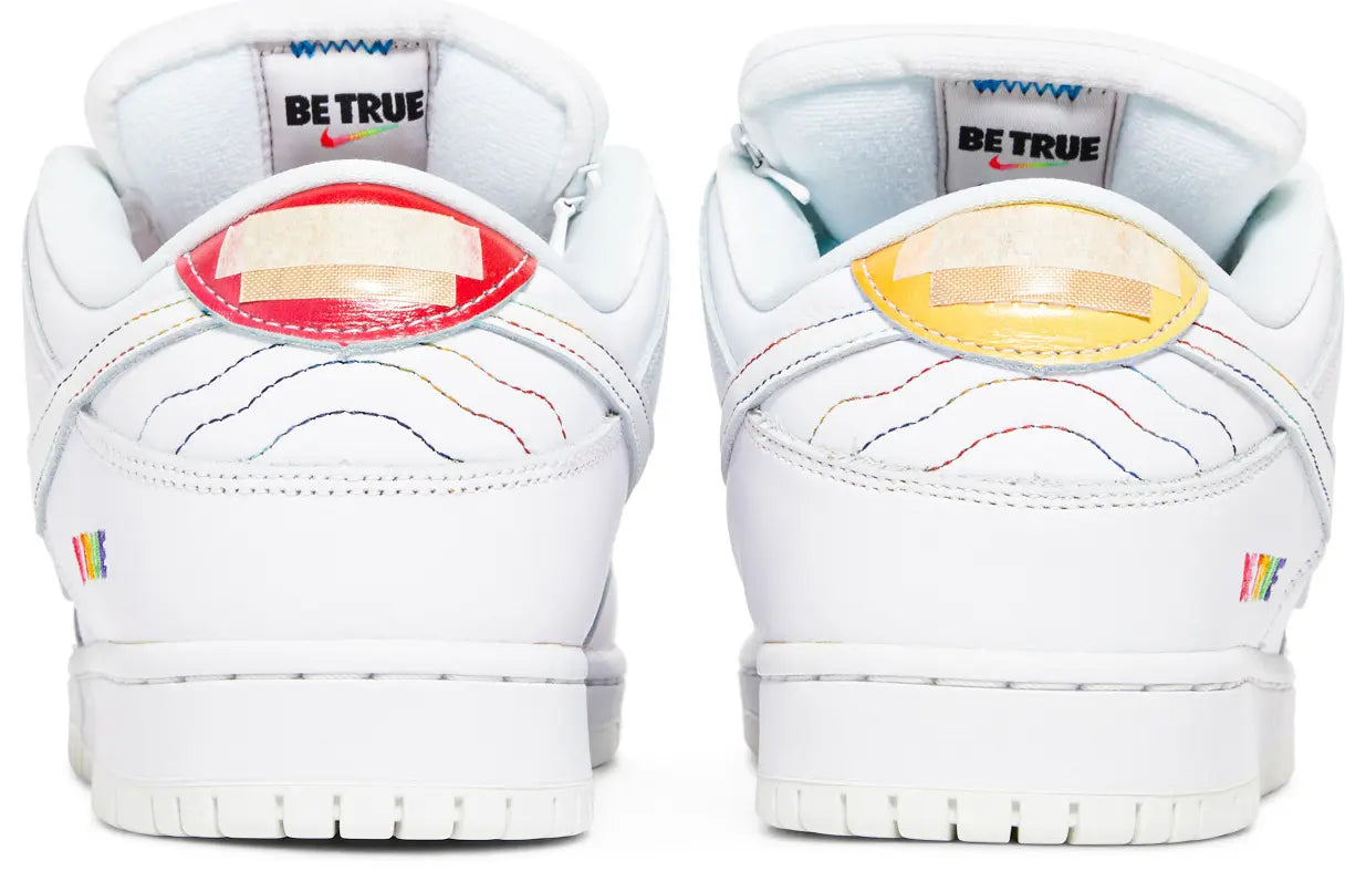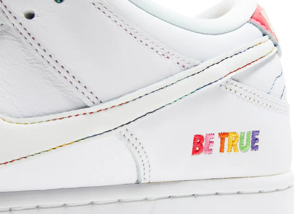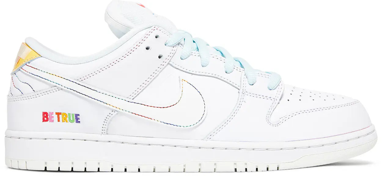 Launching during Pride Month 2022, the Nike Dunk Low SB ‘Be True’ celebrates the LGBTQIA+ community with a unique design centered around individual expression. The low-top carries a leather upper with a crisp white top layer that’s designed to wear away, revealing multicolored panels underneath. A Nike wordmark is debossed on mismatched heel tabs in bright purple and teal, while ‘Be True’ is inscribed on the lateral heel in embroidered lettering. The phrase is repeated on the foam sockliner, featuring a springy Zoom Air unit embedded in the heel.