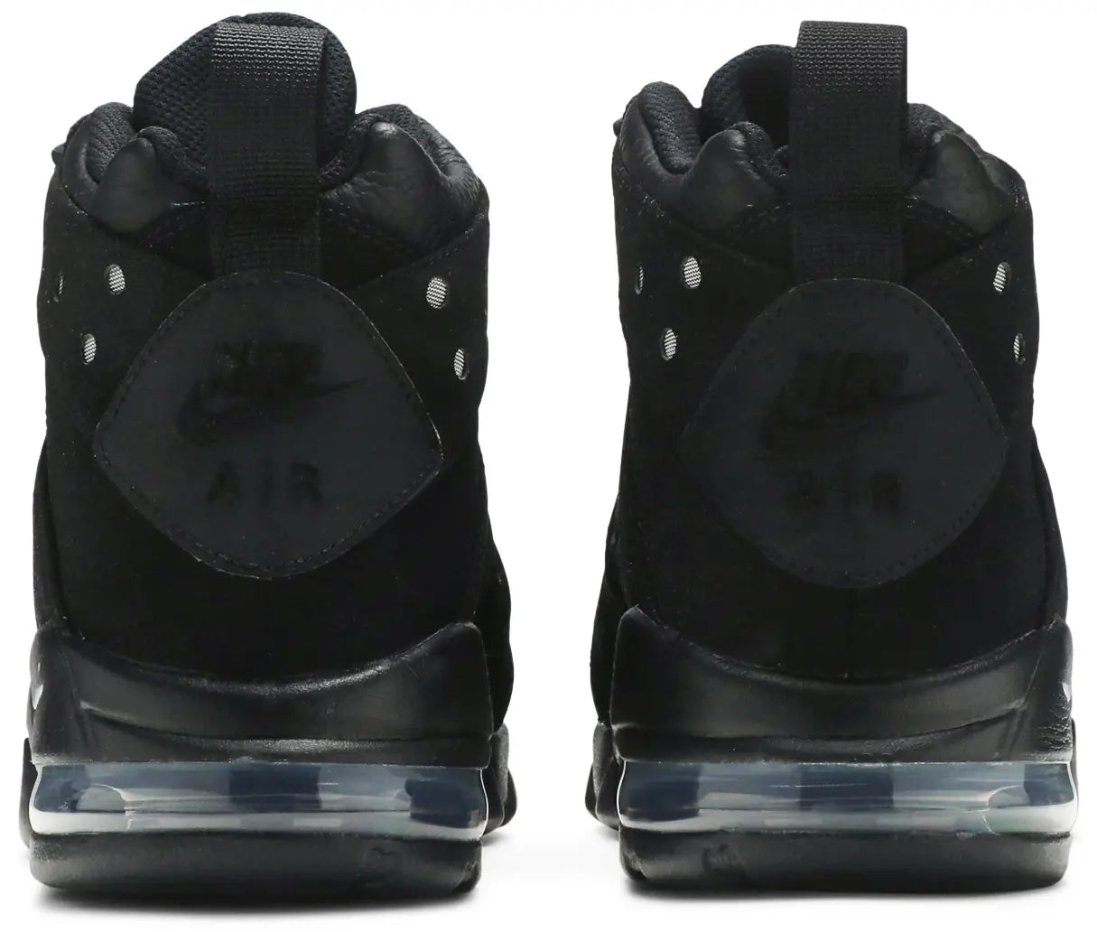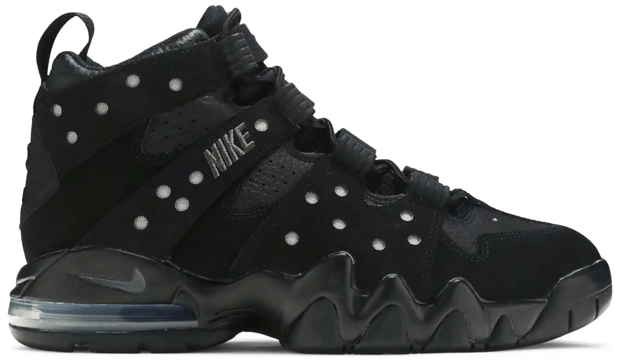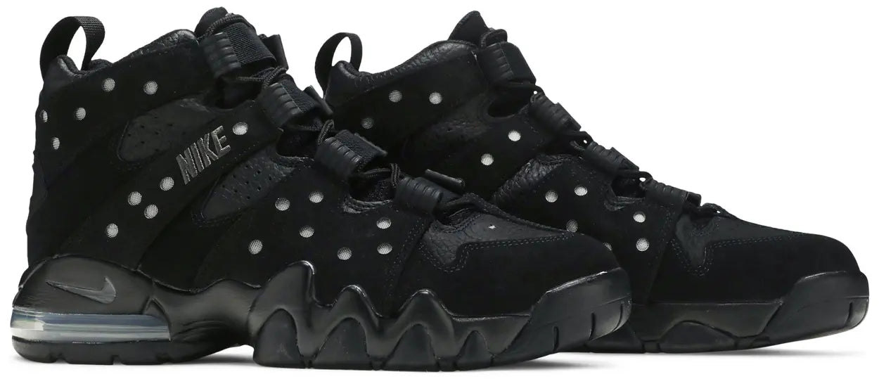 The 2023 edition of the Nike Air Max 2 CB 94 ‘Triple Black’ brings back Charles Barkley’s signature in an OG colorway, featuring a blacked-out upper in a combination of leather and nubuck. Nike branding is embroidered on the lateral side in dark grey stitching, while a series of circular perforations reveal a silver mesh underlay. A speed lacing system, along with a webbing pull tab at the heel, allow for easy on and off. The sneaker rides on a matching black foam midsole, fitted with a visible Max Air unit in the heel.