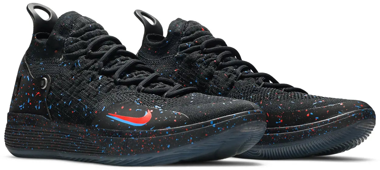 The Zoom KD 11 ‘Just Do It’ celebrates Nike’s long-running slogan with an all-over confetti-like design covering both the shoe’s black Flyknit upper and matching black React foam midsole. In addition to the flecks of Bright Crimson and Photo Blue, the mid-top is accented with a dual-layer Swoosh on the lateral toe and a woven Nike branded tag that hangs off the heel panel.