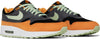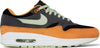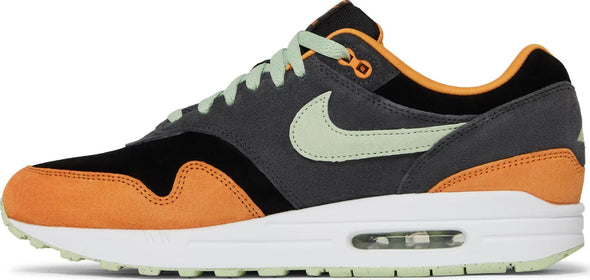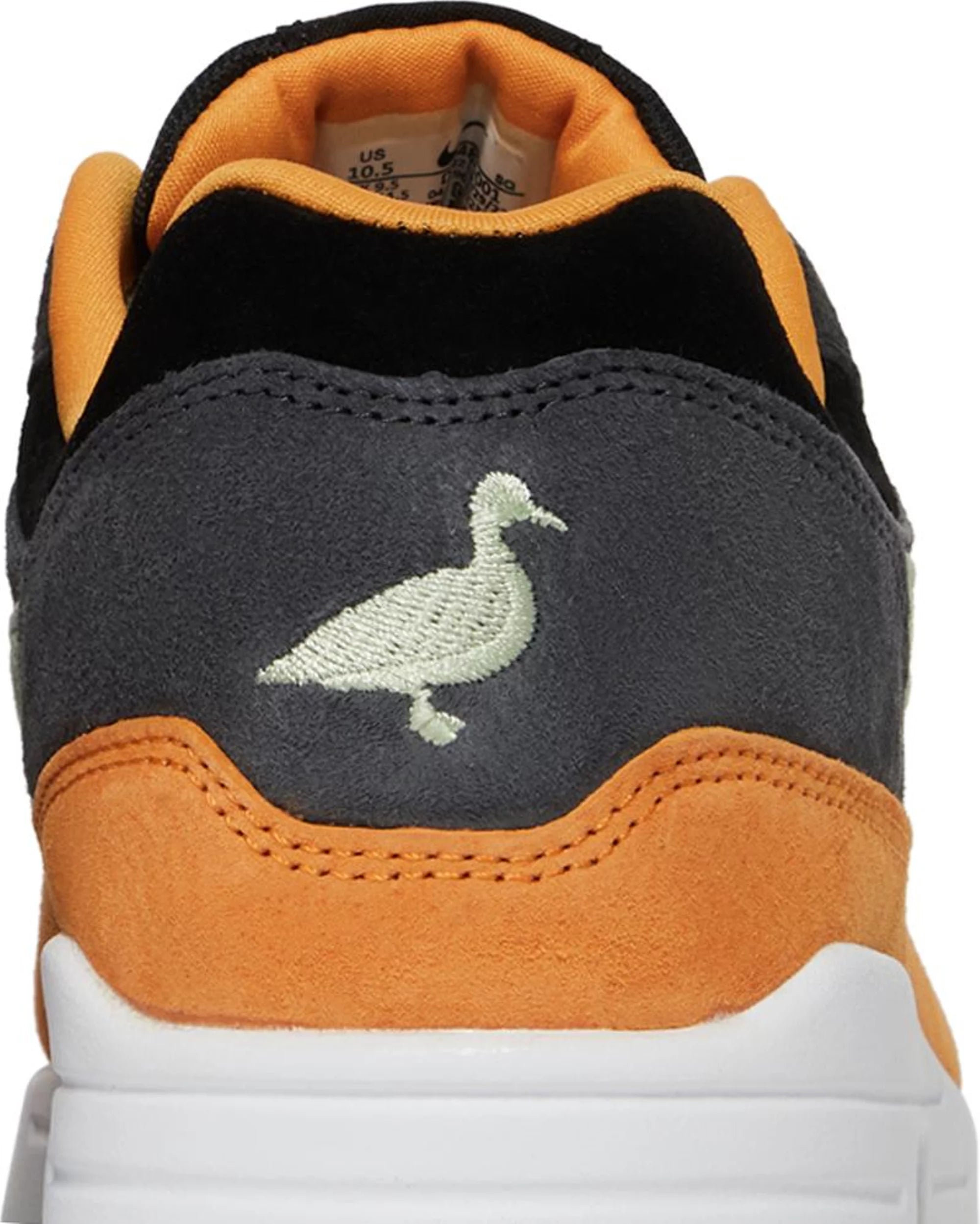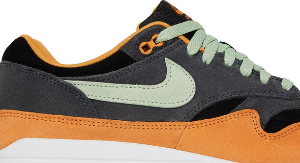 The Nike Air Max 1 Premium ‘Honeydew’ showcases premium materials and colors. The retro runner is updated with a soft suede upper, featuring a black base, charcoal grey overlays and a mint green Swoosh. Contrasting orange accents settle on the mudguard, collar lining, and molded eyelets. An embroidered duck graphic replaces traditional Nike Air branding on the heel overlay. The sneaker sits atop a crisp white polyurethane midsole with visible Air-sole cushioning in the heel and a green rubber outsole underfoot.