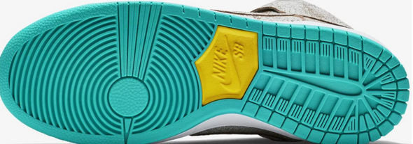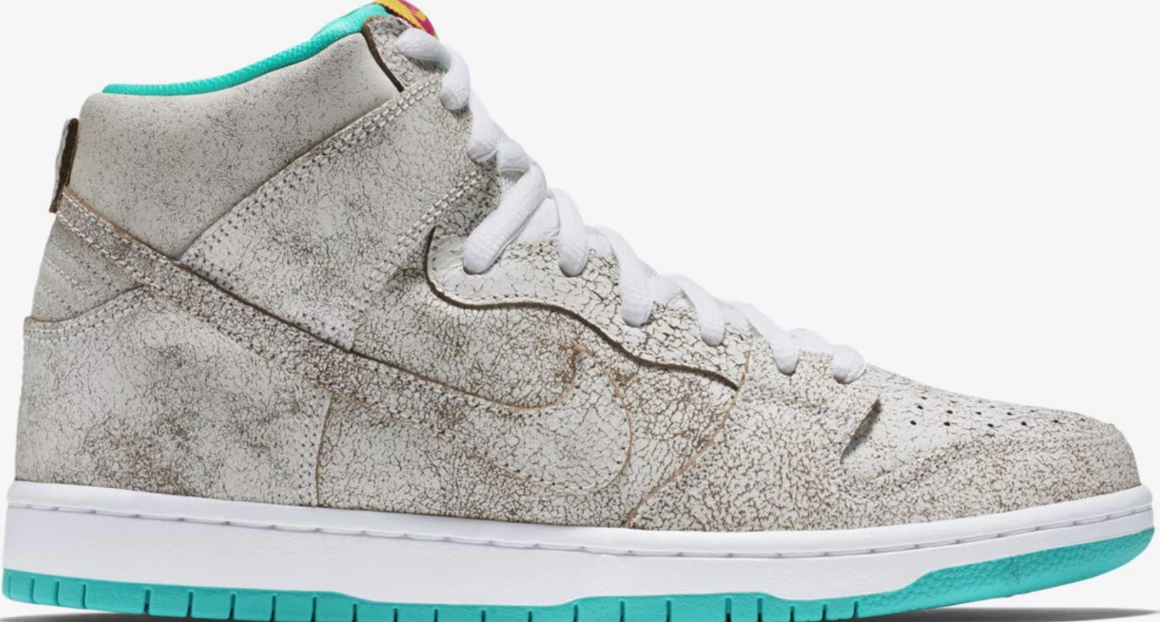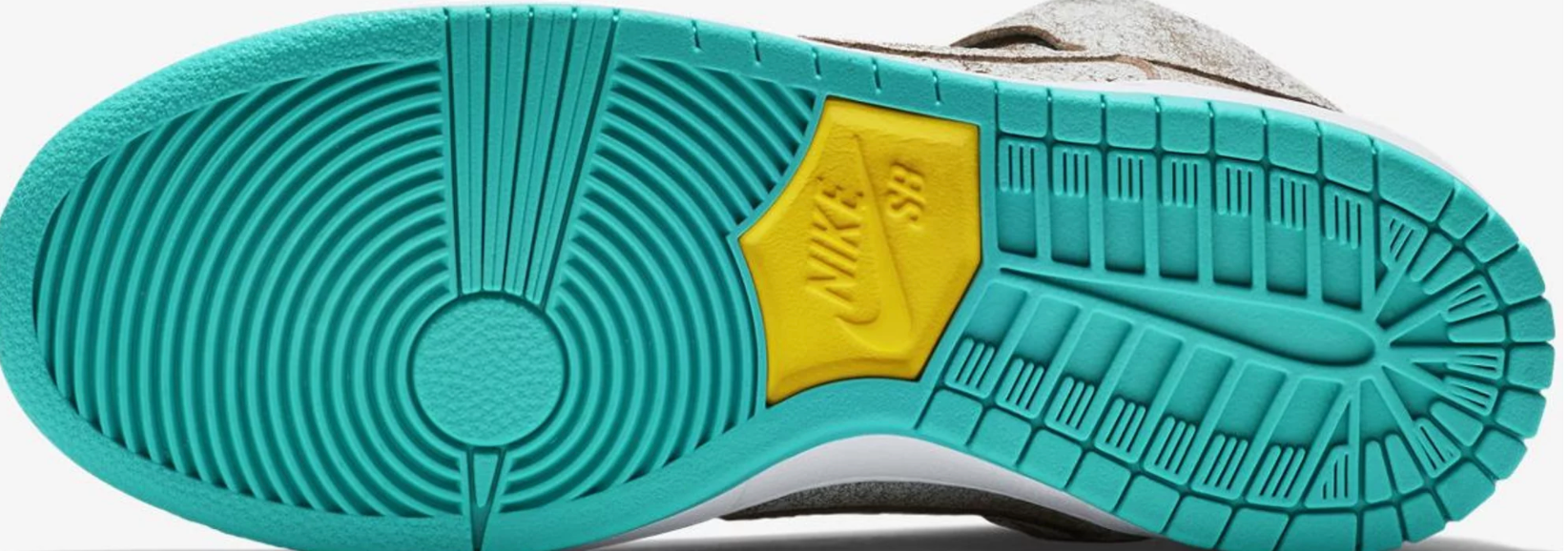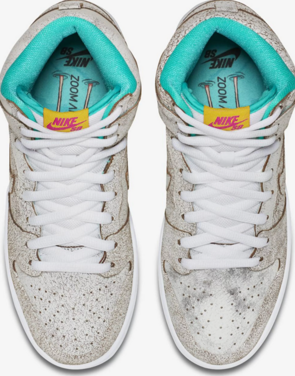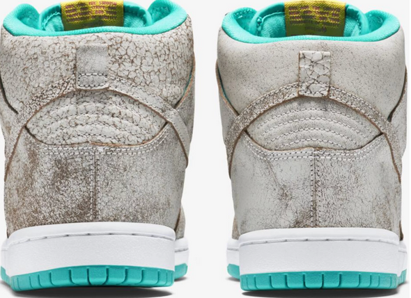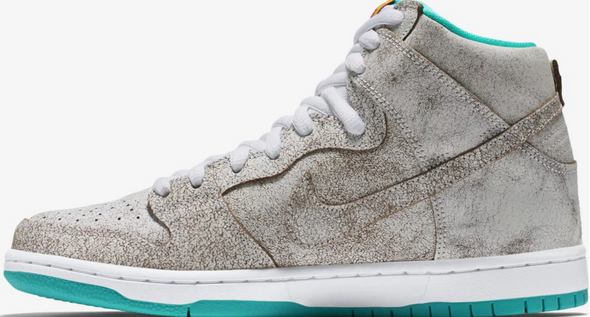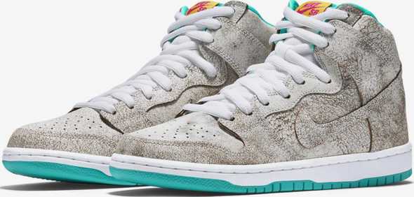 The upper of the 'Flamingo' edition of the Dunk High Premium SB is finished with a grey cracked-earth effect, the design sitting in stark contrast to the Hyper Jade touches on the outsole and inner lining. The insole reveals the inspiration for the shoe’s name, sporting a cartoon flamingo graphic. Keeping skate performance in mind, the shoe includes Zoom Air cushioning in the midsole and a padded collar.