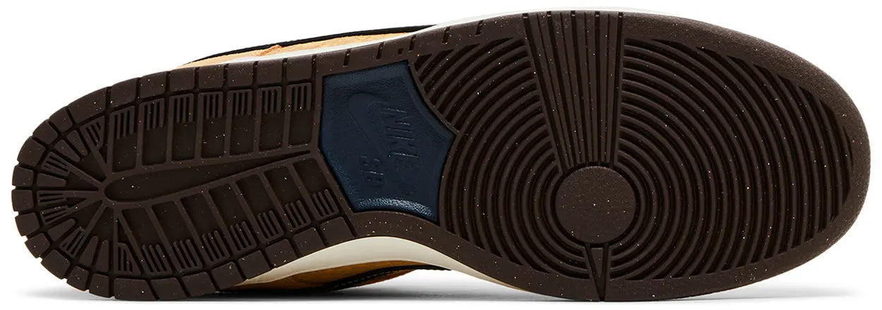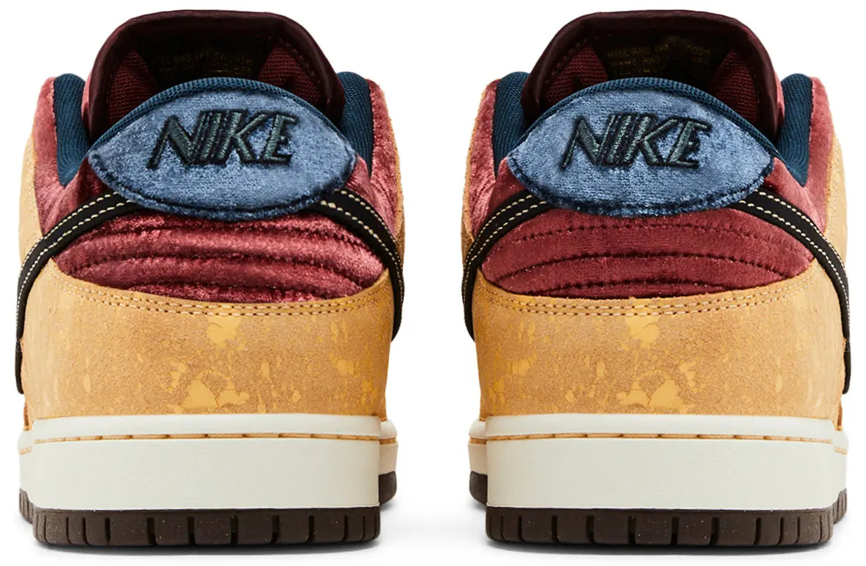 The Nike Dunk Low SB 'City of Cinema' celebrates the robust film culture of Paris. Inspired by the look of arthouse movie theaters, the retro silhouette sports a golden tan cracked leather upper with a black leather Swoosh outlined in contrast stitching. Plush velvet in a rich burgundy hue is utilized on the collar and tongue, marked with a woven Nike SB tag. An embroidered Nike wordmark graces the navy velvet back tab. Inside the shoe, the custom graphic insole depicts drawn curtains and the iconic comedy and tragedy masks.