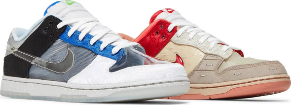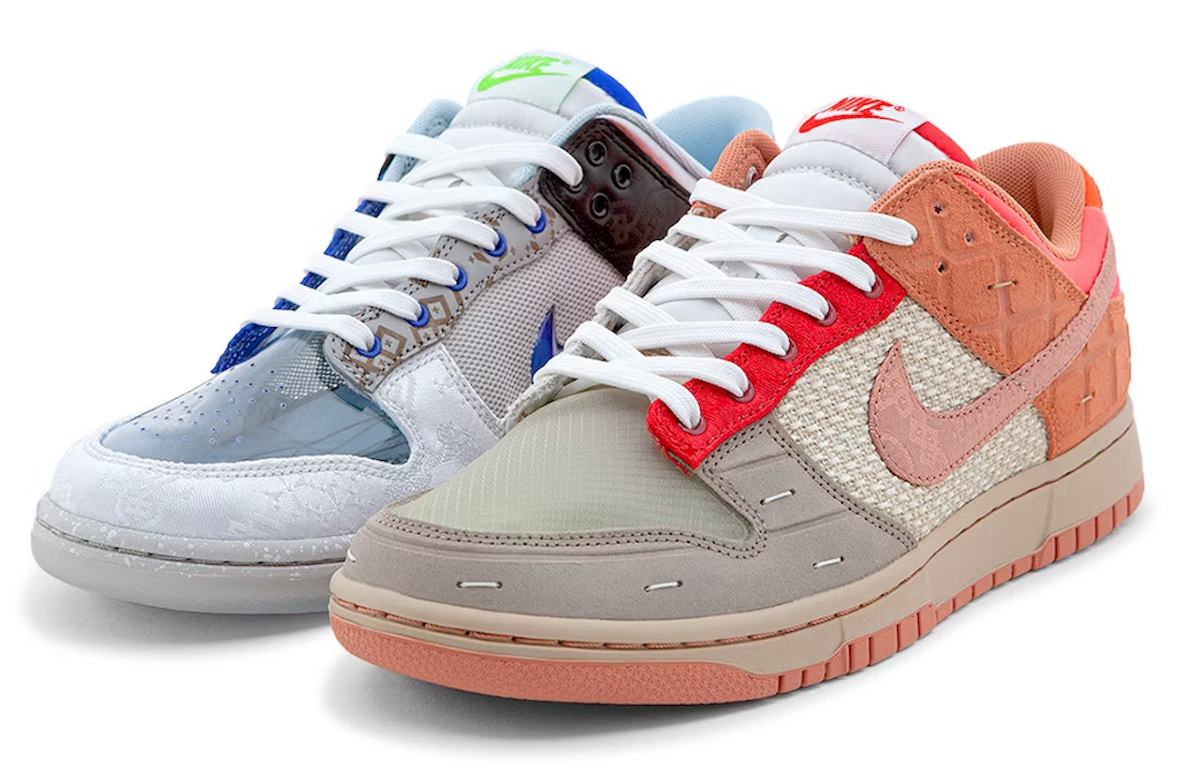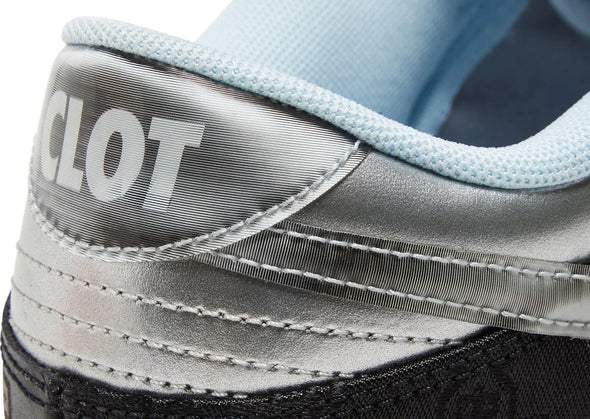 Celebrating the 20th anniversary of the Hong Kong streetwear brand, the CLOT x Nike Dunk Low SP ‘What The’ delivers a mashup colorway inspired by past Nike and Jordan collaborations. Contrasting warm and cool palettes are executed on each mismatched shoe, featuring a familiar assemblage of materials and details. They include the clear toe box of the Air Max 1 ‘Kiss of Death’ from 2006, the embossed suede paneling of the Terracotta Warriors-inspired Air Jordan 13 Low from 2018, and textile overlays finished in CLOT’s iconic Silk Royale pattern, borrowed from the partner brands’ series of Air Force 1s. Special 20th anniversary branding appears on the custom sockliner of the left shoe.