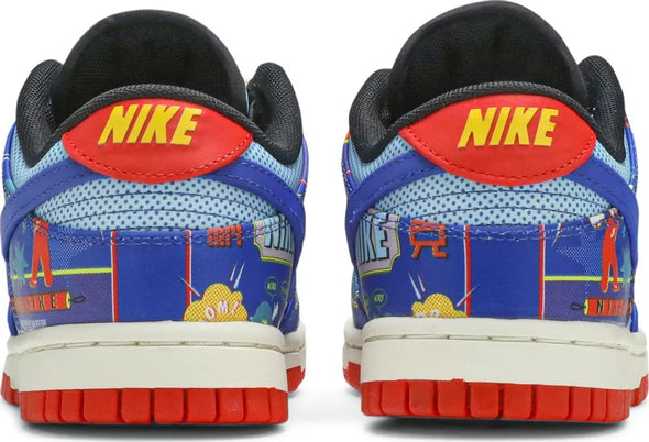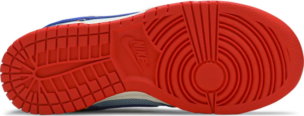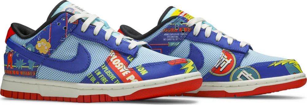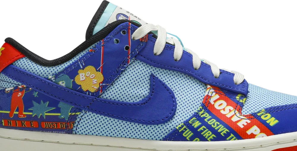 Celebrating Chinese New Year, the Nike women’s Dunk Low ‘Firecracker’ features a colorful exterior that reveals hidden layers, all based around the sneaker’s explosive theme. The sneaker’s mismatched tongue tags act as warning labels, while the cartoon graphics on the royal blue overlays replicate the look of firecracker wrapping paper. The entirety of the sneaker’s outer layer can be worn away to reveal bright red coloring representing the firecracker casing. Underneath the red surface, a tertiary layer is rendered in black and grey, denoting the gunpowder residue from a spent firecracker.