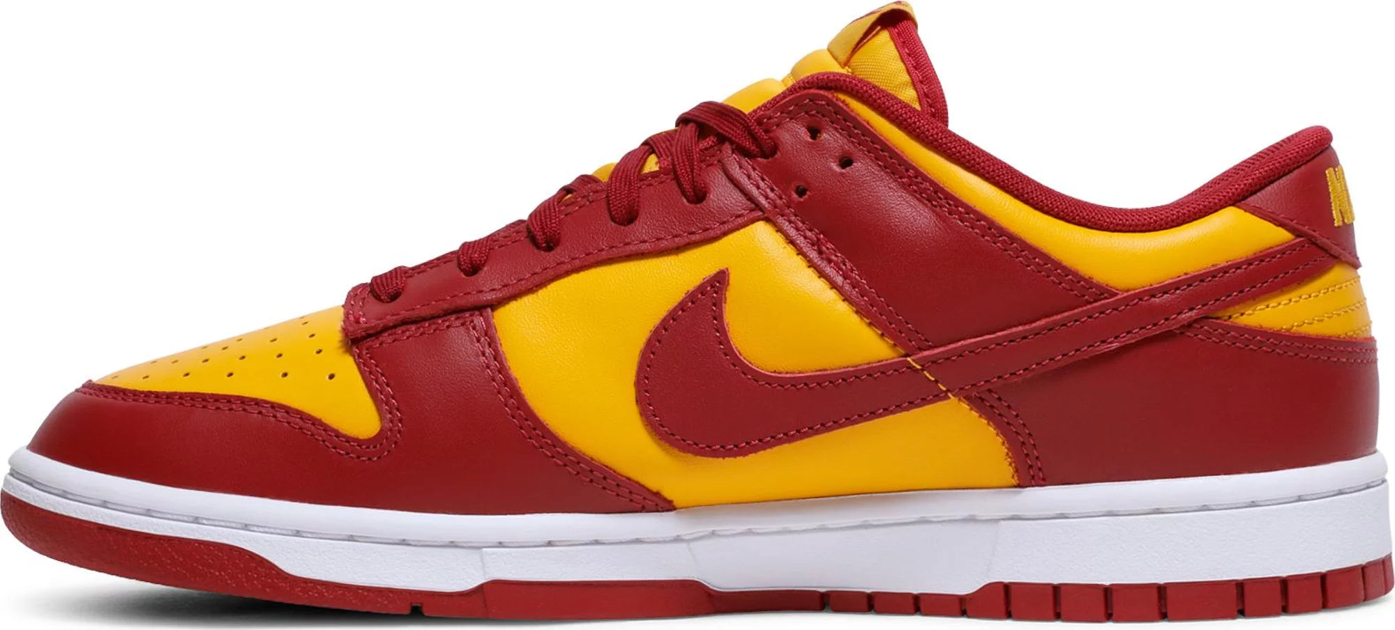 The Nike Dunk Low 'Midas Gold/USC' recalls the colors of the University of Southern California Trojans & Kansas City Chiefs on the retro basketball silhouette. The updated two-tone palette on the sneaker’s leather upper features dark red overlays and Nike Swoosh on top of a golden yellow base. A woven Nike tag on the nylon tongue and embroidered Nike wordmark on the heel tab complete the upper while a rubber, grippy outsole anchors the build of the shoe.