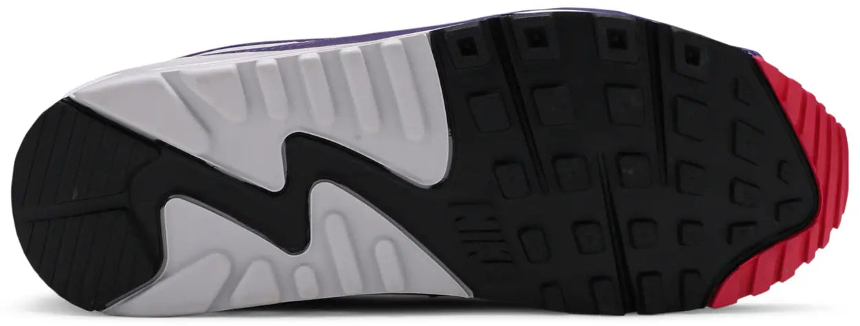 The women’s Nike Air Max 90 ‘Eggplant’ updates the retro silhouette with contrasting flashes of color while maintaining the sneaker’s OG materials. A breathable white mesh upper is accented with a red synthetic suede Swoosh and violet detailing on the leather mudguard, TPU eyelets and Nike-branded heel badge. Lightweight cushioning comes courtesy of a soft foam midsole, enhanced with a visible Max Air unit embedded in the heel.