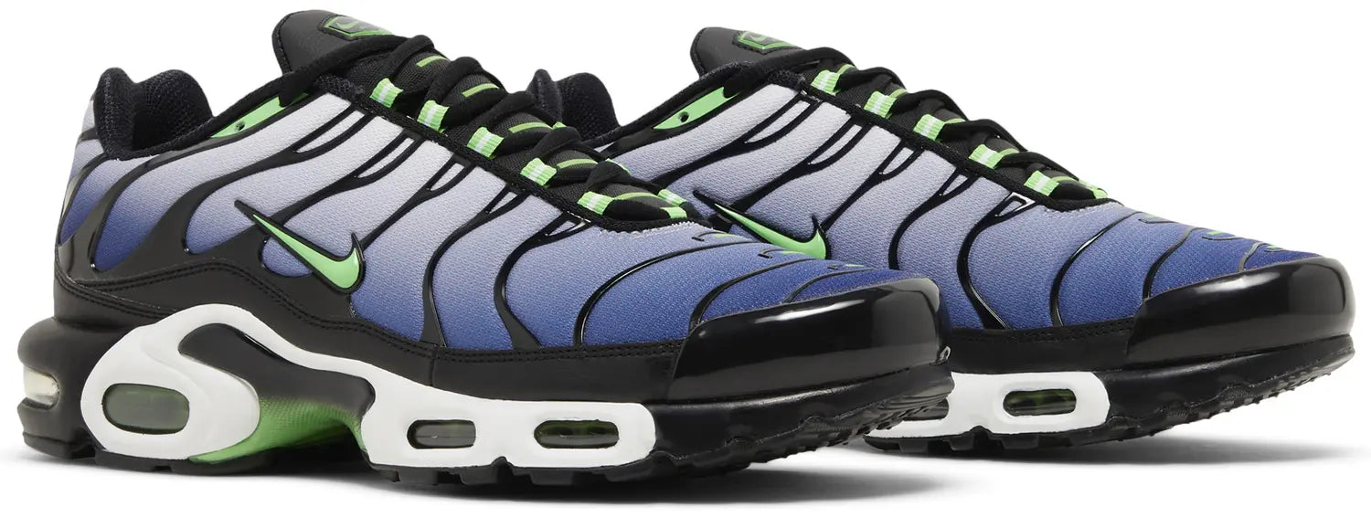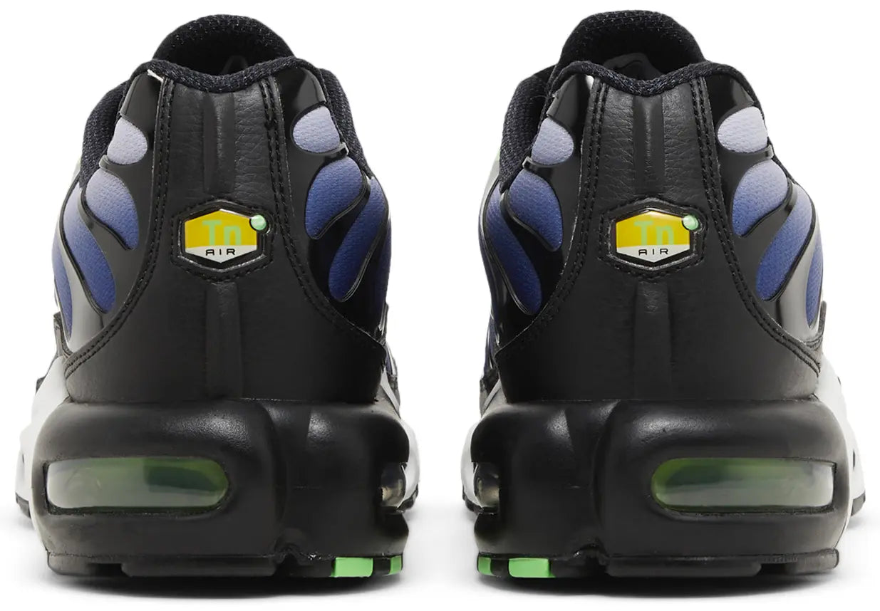 Step into bold style with the Air Max Plus 'Icons - Black Scream Green.' These kicks mix sleek black with a pop of vibrant green, making every step a statement. Designed for comfort and eye-catching flair, they’re perfect for those who love to stand out while staying comfy all day long. Ready to turn heads? These are your go-to sneakers!
