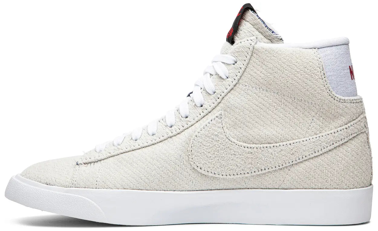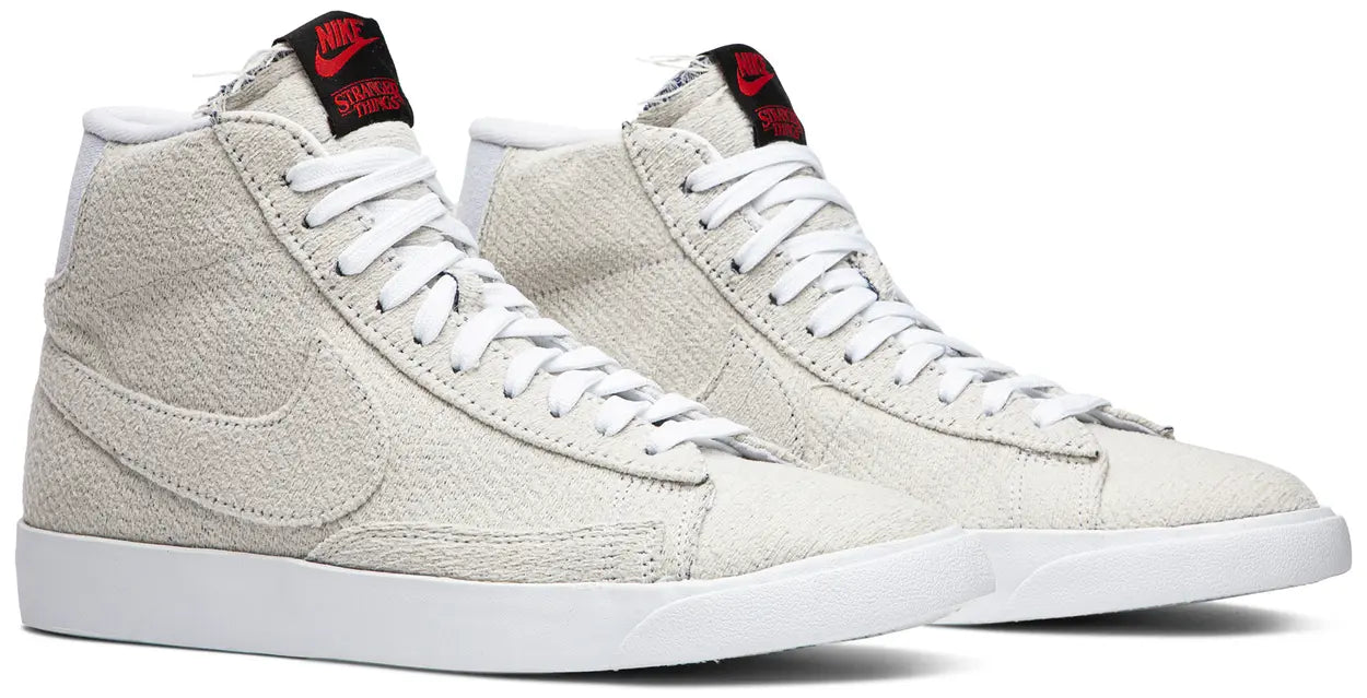 Offering a thematic take on a classic Nike silhouette, the Stranger Things x Blazer Mid QS 'Upside Down' released in August 2019 following the third season premiere of the Netflix Original show. This edition features a mid-top, woven upper in an unassuming Sail hue. The outer layer can be burned away to reveal an alternate, 'Upside Down' look, a feature cautioned on the tongue. Red co-branding hits identify the collaboration, complemented by sketches on the insoles highlighting key moments from the season. Each shoe in the pack arrived in a coordinating, black-and-red box.