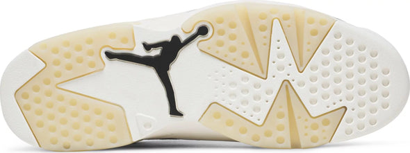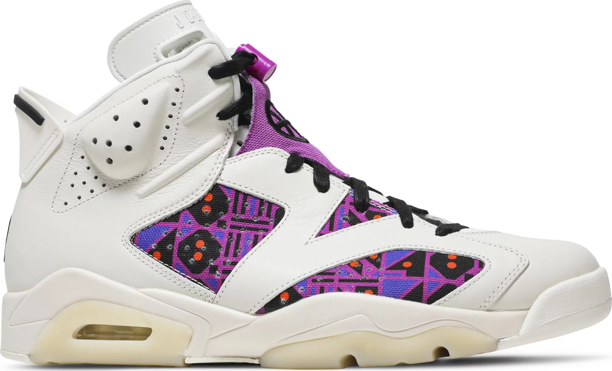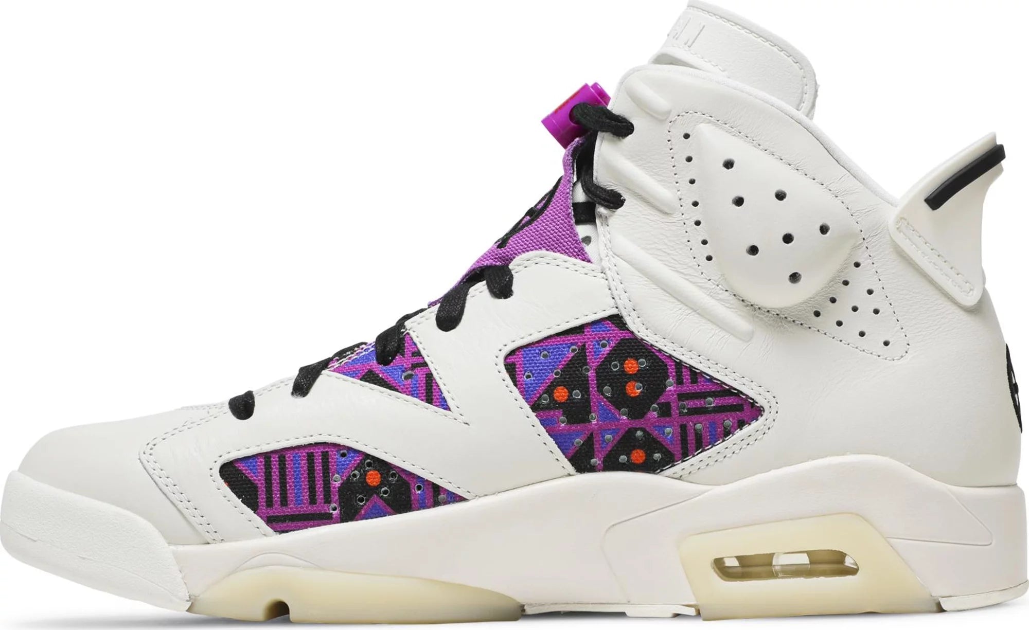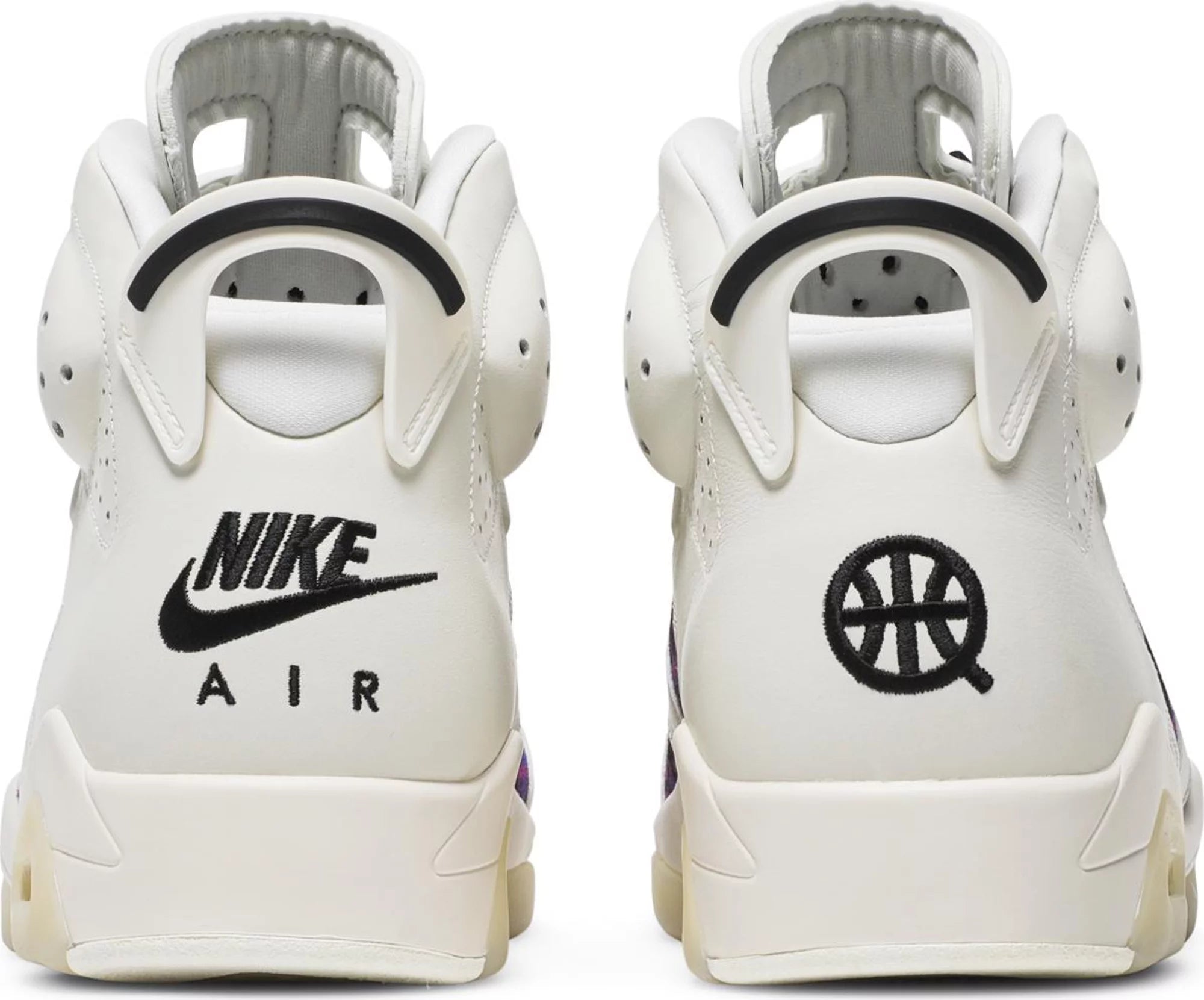 The Air Jordan 6 Retro ‘Quai 54’ celebrates the annual Parisian streetball tournament with a textile base covered in a purple and black print that recalls Bogolan graphics from West Africa. The rest of the upper is constructed from leather in off-white Sail, with both materials accented with perforated detailing that reveals 3M reflective inlays underneath. Nike Air branding adorns the heel of the left shoe, while the Qual 54 logo is displayed on the opposite heel.