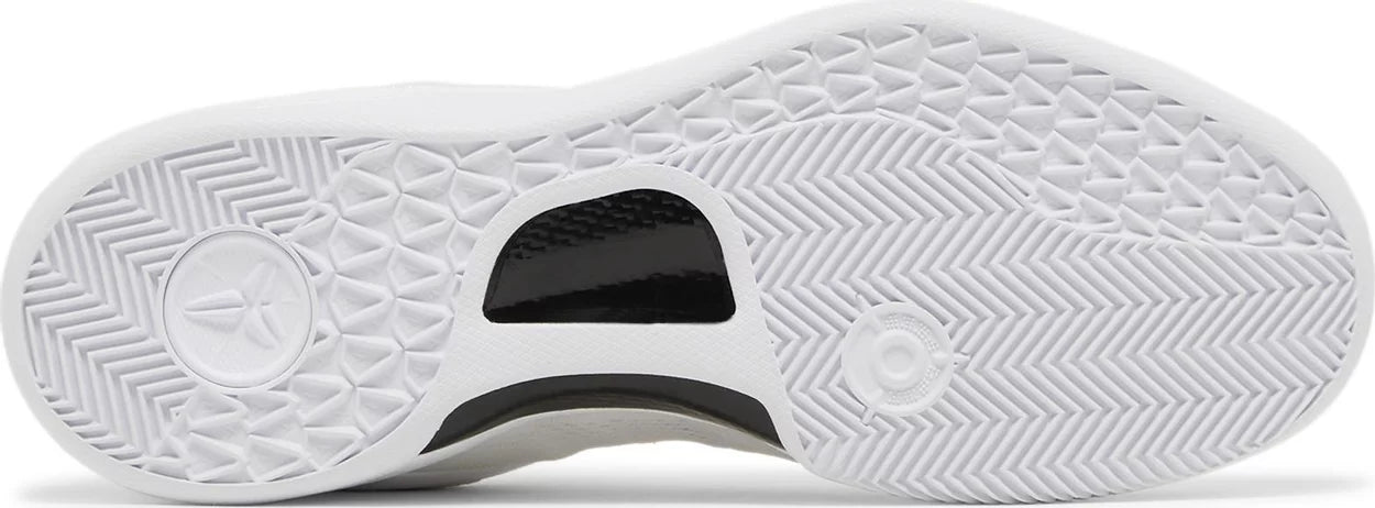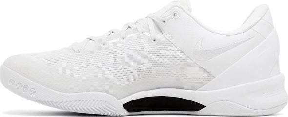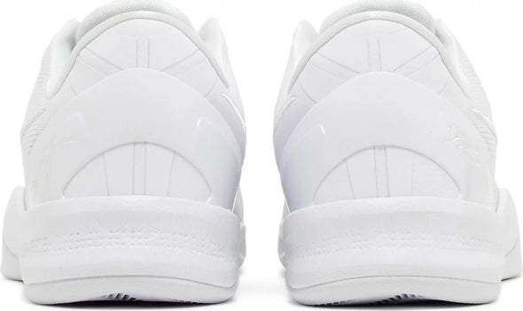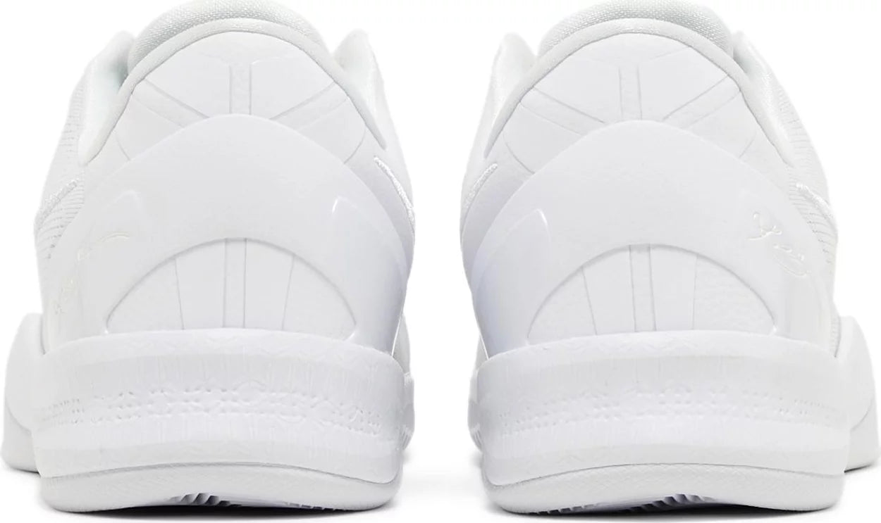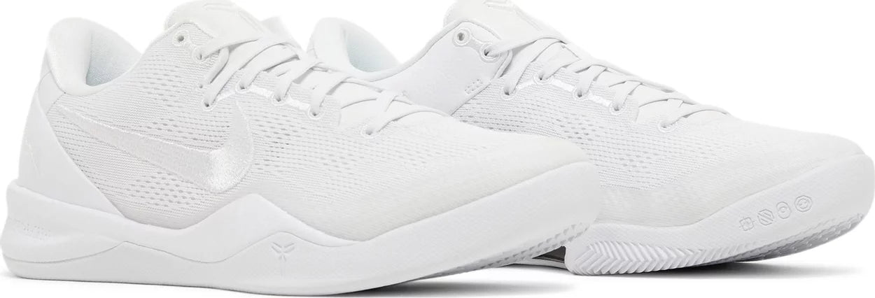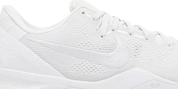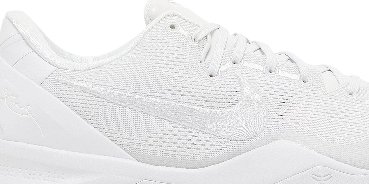 The Nike Kobe 8 Protro 'Halo,' also known as the 'Triple White,' brings back a retooled version of Kobe Bryant's eighth signature shoe in a blank-slate finish.. Designed by Eric Avar, the low-top features an all-white engineered mesh upper with tonal embroidered Swoosh branding. Kobe Bryant’s signature is etched on the external heel counter, while the athlete’s personal logo decorates the tongue. Performance benefits include a drop-in React midsole and carbon fiber shank. Underfoot, a herringbone-tread outsole delivers stop-and-go traction.