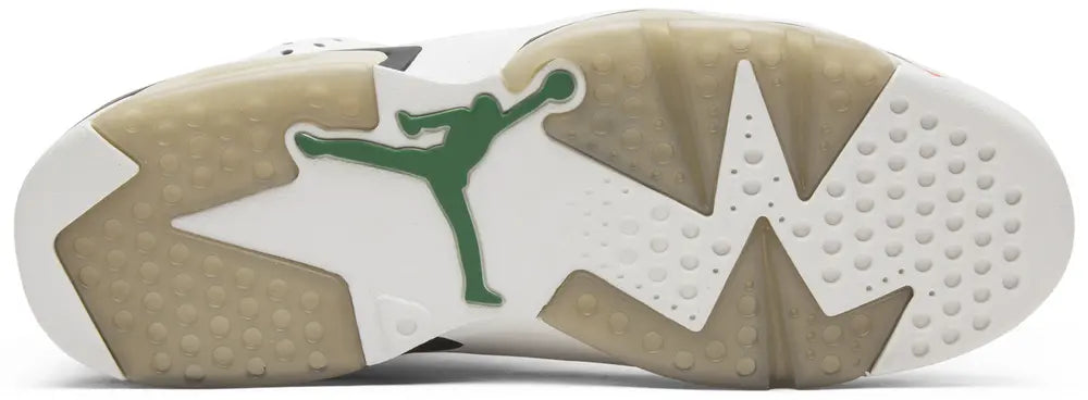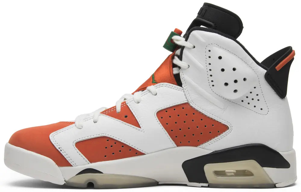 The Air Jordan 6 Retro ‘Gatorade’ pays tribute to Michael Jordan’s 1991 ‘Be Like Mike’ Gatorade commercial. The shoe features the same color blocking as the OG ‘Carmine’ colorway, with a white leather upper, Gatorade-themed Team Orange accents, and a green lace lock. The spot’s slogan – “If I could be” – also hits up the inner tongue. The ‘Gatorade’ dropped with a ‘Green Suede Gatorade' colorway in December 2017.
