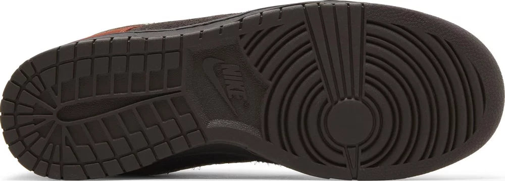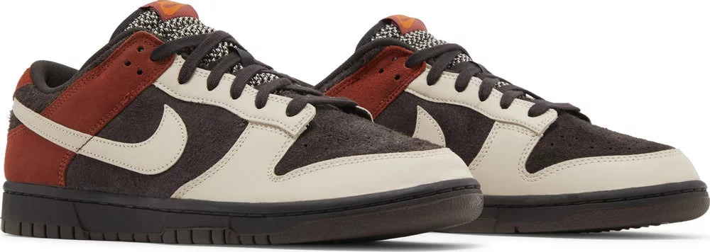 The Nike Dunk Low ‘Red Panda’ spotlights a distinctive palette inspired by the elusive Himalayan mammal. The upper features a shaggy suede base in a Velvet Brown hue, contrasted by forefoot and heel overlays in Sand Drift leather and Rugged Orange suede. Atop the patterned textile tongue, a woven tag displays Nike branding in Campfire Orange. The sneaker rests on a dark brown rubber cupsole, built with stitched sidewall construction and an interior foam wedge.