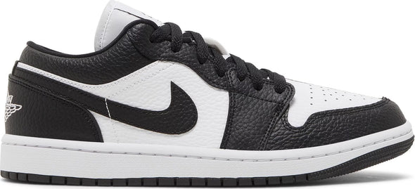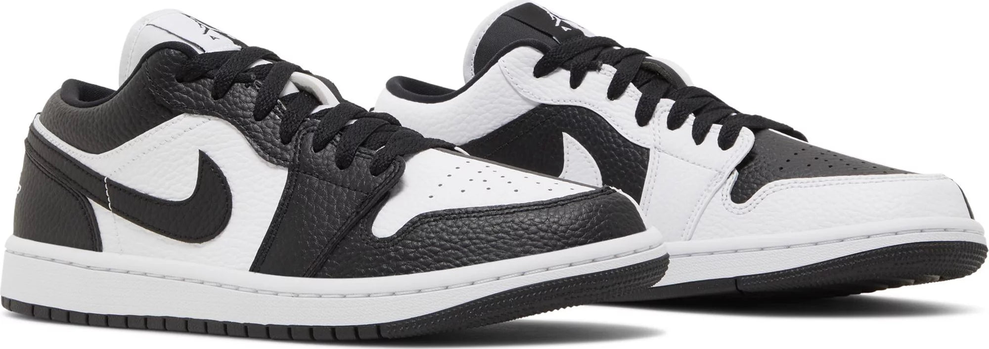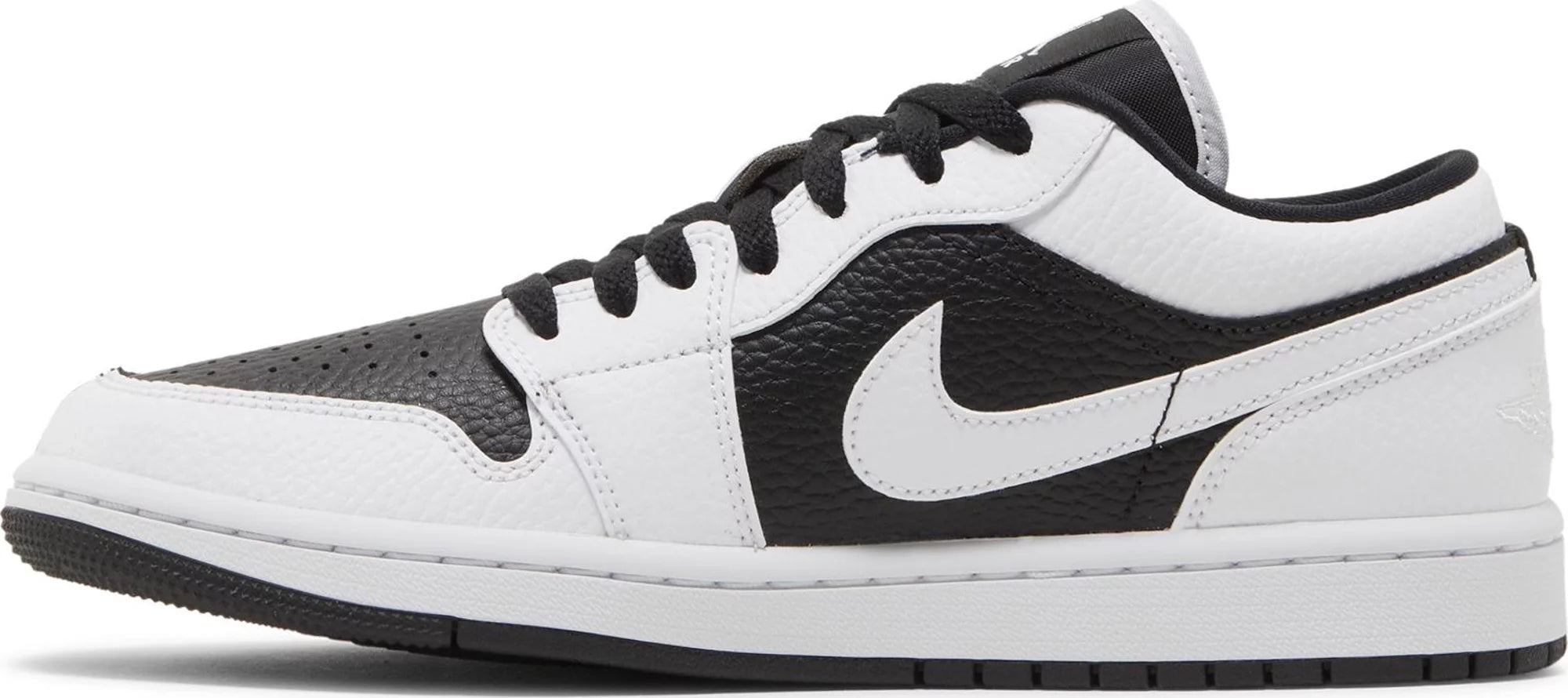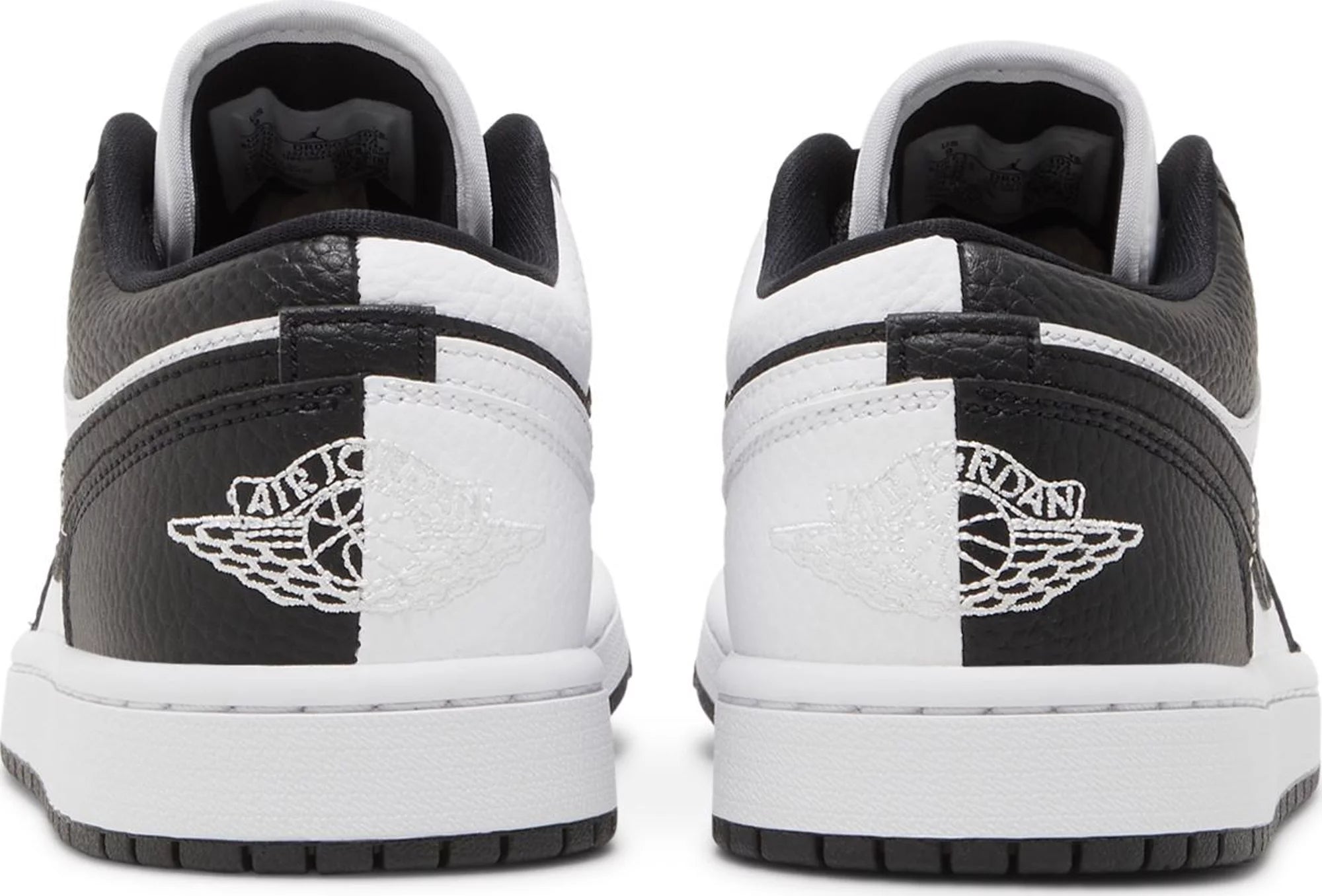 The women’s Air Jordan 1 Low SE ‘Homage’ showcases split color blocking that recalls the ‘Homage to Home’ Air Jordan 1 High from 2018. The tumbled leather upper on each shoe features a white base with contrasting black overlays on the lateral side, and a black base with white overlays on the medial side. The split theme extends to the Jumpman tongue tag and the Wings logo embroidered on the heel. Both shoes are mounted on a rubber cupsole, highlighted by white sidewalls and a black rubber outsole.