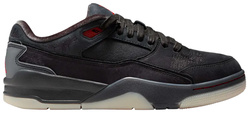 The Who Decides War x Women's Jordan Flight Court 'The World Is Your Court' delivers the New York fashion brand's stylish take on the retro-inspired silhouette. Waxed laces secure a black leather upper with tonal canvas quarter panels. Stitched detailing covers the shoe's high-wear areas for a distressed aesthetic. An embroidered Jumpman icon in Varsity Red graces the grey leather heel overlay, matching the molded eyelets and a second Jumpman logo atop the tongue. The latter is inscribed with 'The World Is Your Court' on the interior side. Underfoot, the semi-translucent rubber outsole features a herringbone tread for optimal grip.