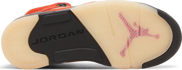 The Women’s Air Jordan 5 Retro ‘Dunk on Mars’ pays homage to Spike Lee’s alter ego, Mars Blackmon, whose planetary namesake is also known as the Red Planet. To that end, the heritage silhouette sports a scarlet suede upper, accented with translucent quarter-panel netting and contrasting black eyelets. Jumpman branding appears on the silver reflective tongue, while ‘23’ is embroidered on the lateral heel. The sneaker rides on an Air-assisted black polyurethane midsole with fiery shark-tooth detailing in orange and red. Underfoot, a yellow-tinged translucent rubber outsole features a herringbone tread for optimized grip.