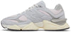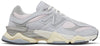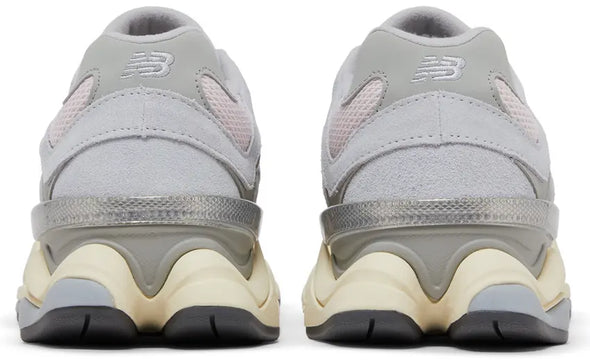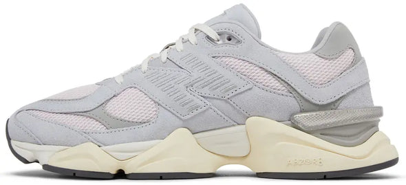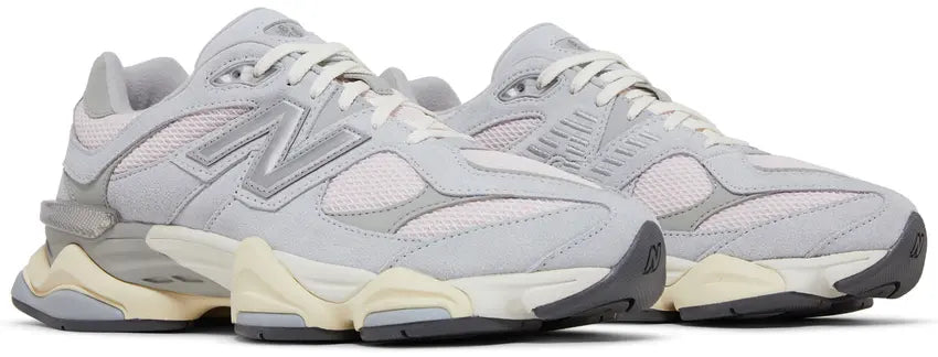 The New Balance 9060 'Granite' combines steel grey suede paneling with open-cell mesh construction in a subtle pink hue. Branding elements include a jeweled NB 9060 tongue badge and a silver 'N' logo on the lateral side. Anchoring the sneaker is a stacked dual-density midsole, built with ABZORB and SBS cushioning and supported by a diamond-pattern rubber outsole.