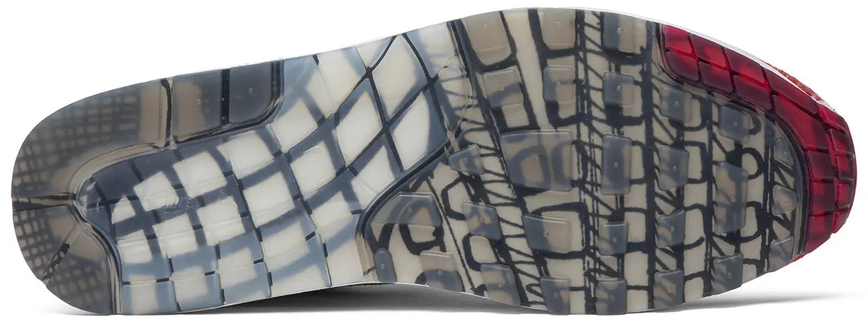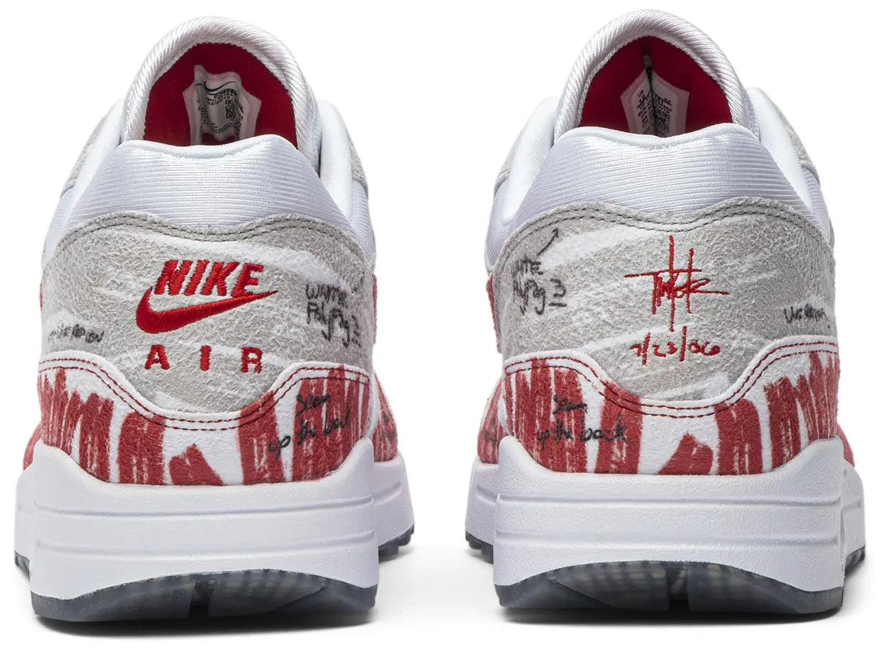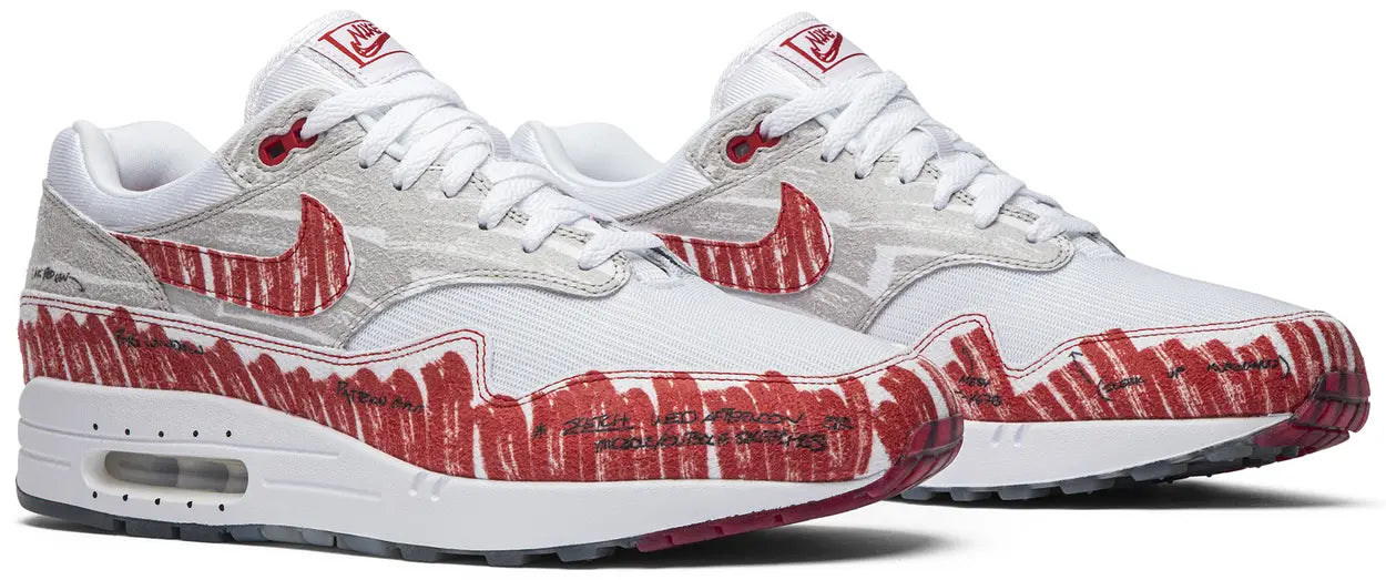 The Air Max 1 'Sketch To Shelf - University Red' reimagines the classic shoe in modified OG detail with a work-in-progress theme. Released in July 2019, the shoe is adorned with original sketch notes and artwork from Nike master designer Tinker Hatfield. The shoe's upper overlay and heel panel are executed in marbled grey synthetic suede, while the Swoosh branding and mudguard are 'colored-in' red like the first version from 1987.