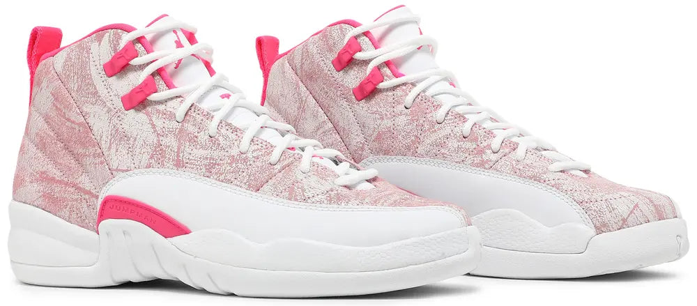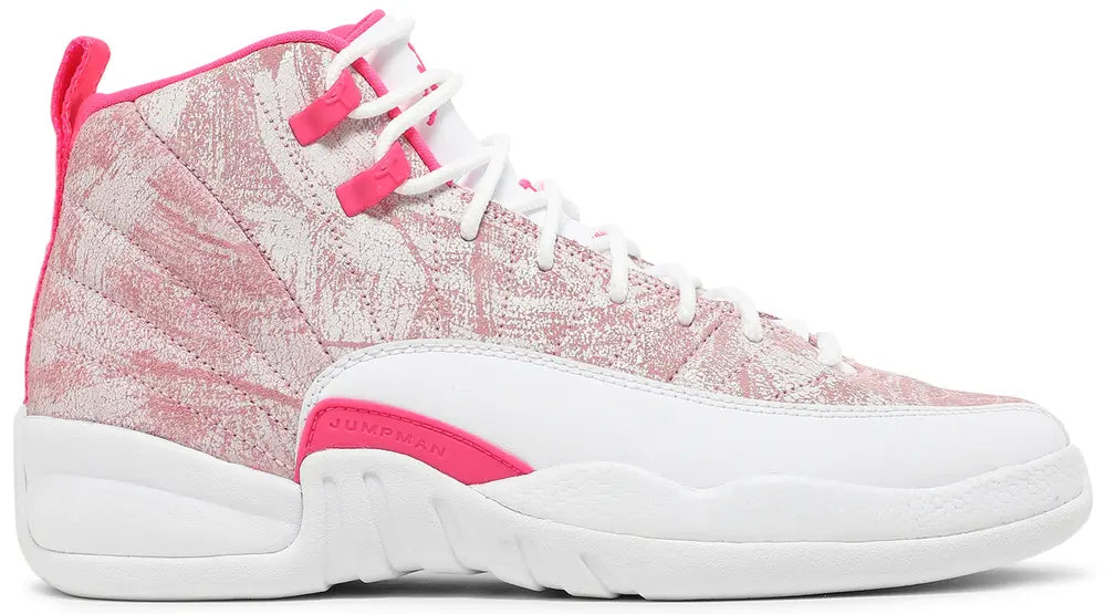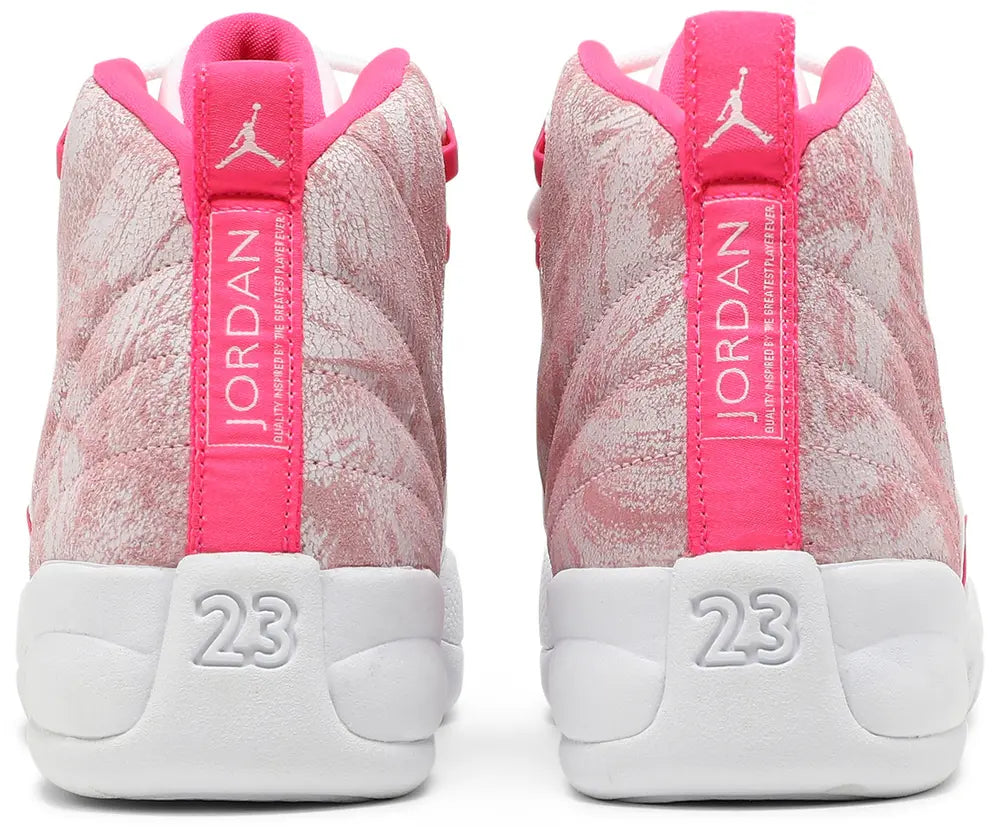 Constructed for big kids, the Air Jordan 12 Retro GS ‘Arctic Pink’ updates the vintage mid-top with energetic pops of color. They take the form of hot pink detailing on the sneaker’s heel tab, molded eyelets and Jumpman tongue branding. A more diffuse shade of pink is spread out over the cracked suede upper to create an irregular, abstract pattern. The mid-top rides on a Phylon midsole, reinforced with a rigid shank plate and a herringbone rubber outsole underfoot.