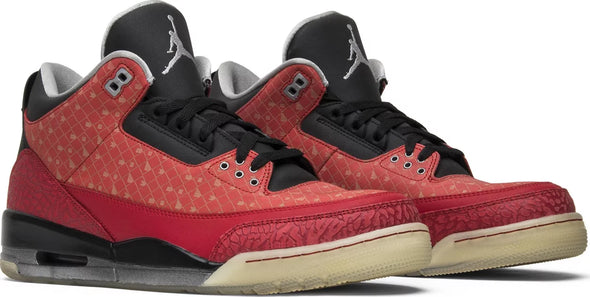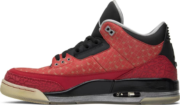 Released in July 2013, this special edition Air Jordan 3 Retro 'Doernbecher' was designed by Cole Johanson, an 11-year-old cancer patient at Doernbecher Hospital. The shoe features a Varsity Red diamond patterned upper with black accents and red elephant print overlays at the toe and heel. It also comes with the words “COURAGE” and “STR3NGTH” on the insole, a black and metallic silver midsole, and an icy blue translucent outsole.