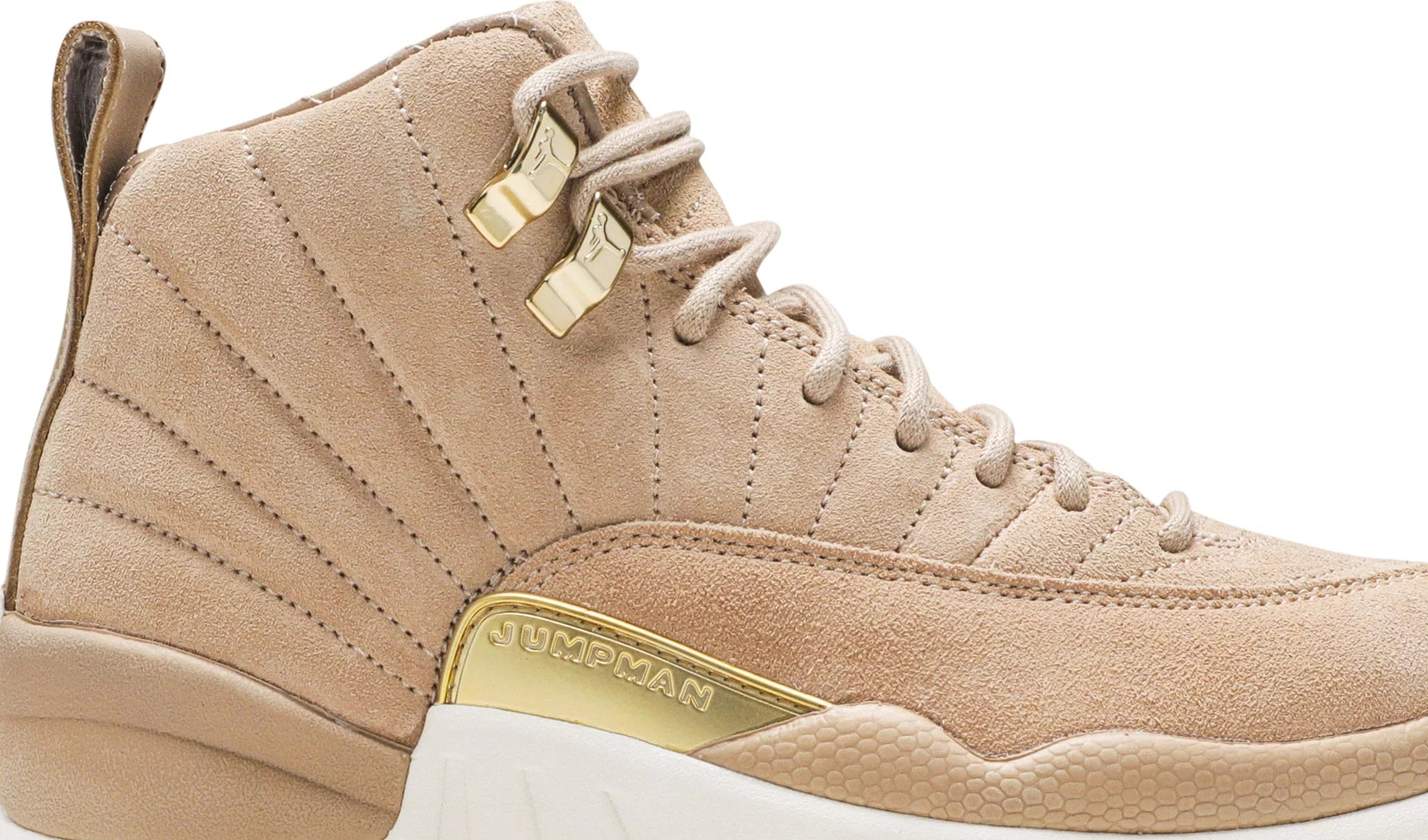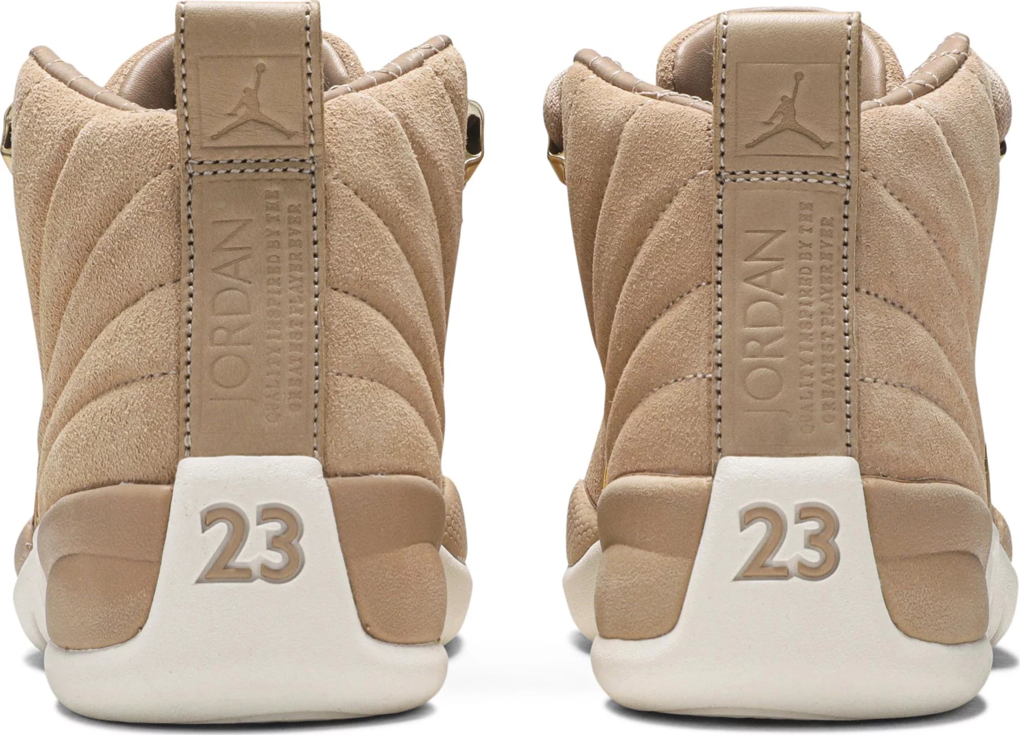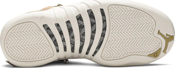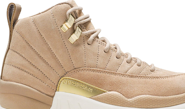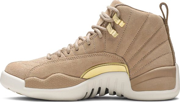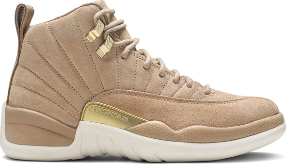 The Women’s Air Jordan 12 Retro 'Vachetta Tan' take the idea of sport and turns it into style by elevating every detail. Constructed with a rich suede upper and quilted interior, the sneaker is the same Air Jordan 12 that everyone is used to but updated with premium materials and construction. An embossed leather heel tab and brushed gold hardware finish the look.