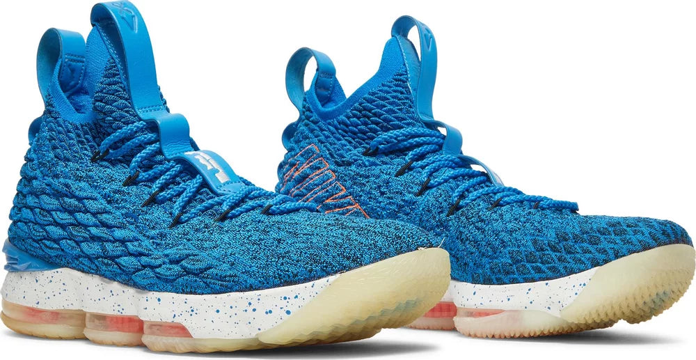 Drawing from both the 2010 LeBron 7 PE and the Cleveland Cavaliers’ old school jersey, the LeBron 15 'Hardwood Classics' sports a textured Battleknit upper dressed in Photo Blue with a sock-like fit around the ankle. The sneaker also features Total Orange accents on the heel tab, the fully exposed Air unit, and Nike branding on the medial heel. Other details include a speckled Photo Blue and white midsole, the LeBron Dunkman logo on the inner tongue and a milky translucent outsole.