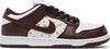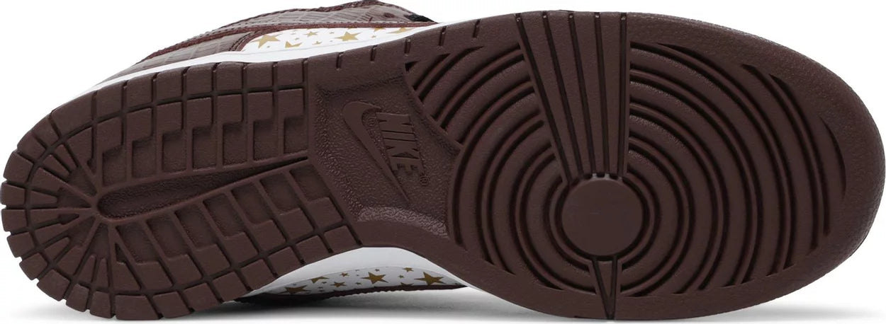 The Supreme x Nike Dunk Low OG SB QS ‘Barkroot Brown’ features a familiar design inspired by the brands’ Dunk High collaboration from 2003, released during the height of the Silver Box era. Like the original, the shoe features a white leather upper, printed gold stars, stuffed textile tongue, flat black laces, a gold Supreme lace jewel, and croc-embossed leather overlays, finished here in a rich brown hue. Inside the shoe, dual Supreme and Nike SB branding decorates the red sockliner, featuring a Zoom Air unit in the heel for responsive cushioning.