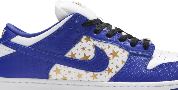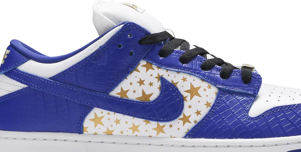 The Supreme x Nike Dunk Low OG SB QS ‘Hyper Royal’ takes direct inspiration from the New York skate brand’s Dunk High collaboration from 2003. Like the high-top, this pair features a white leather base with metallic gold stars on the quarter panels and croc-embossed leather overlays in a contrasting hue. A standard Nike wordmark is embroidered in gold lettering on the heel tab, matching the woven tag atop the stuffed textile tongue. A gold Supreme dubrae shines at the bottom of the lace bed. Lightweight cushioning is provided by a Zoom Air-infused sockliner, its crimson surface embellished with dual Supreme and Nike SB branding.