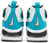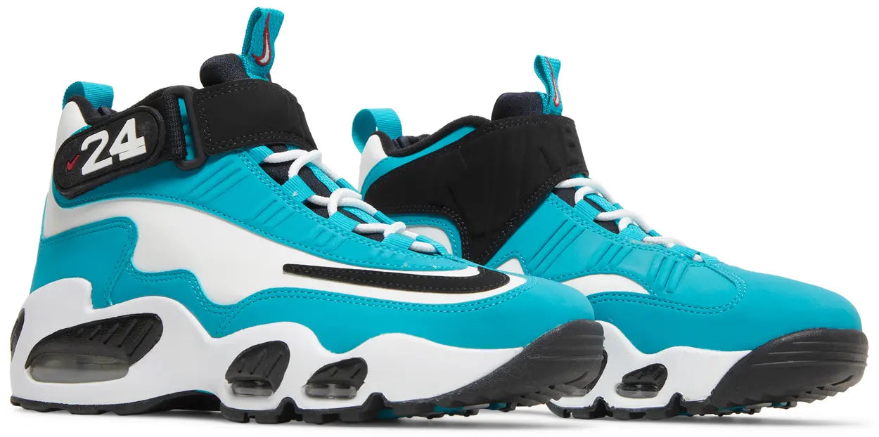 The Nike Air Griffey Max 1 ‘Aquamarine’ brings back Ken Griffey Jr.’s debut signature shoe in a vibrant colorway inspired by the Seattle Mariners’ alternate uniform. The retro trainer features a white synthetic leather upper with turquoise nubuck overlays and a contrasting black Swoosh on the lateral forefoot. Wrapping around the mid-cut collar is a wide ankle strap marked with embossed Nike branding and Junior’s jersey number. The sneaker is mounted on a polyurethane midsole with visible Max Air cushioning in the forefoot and heel.