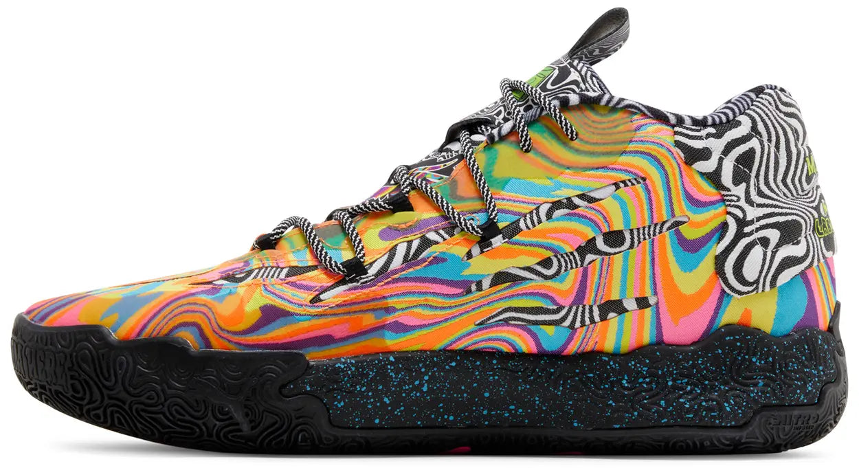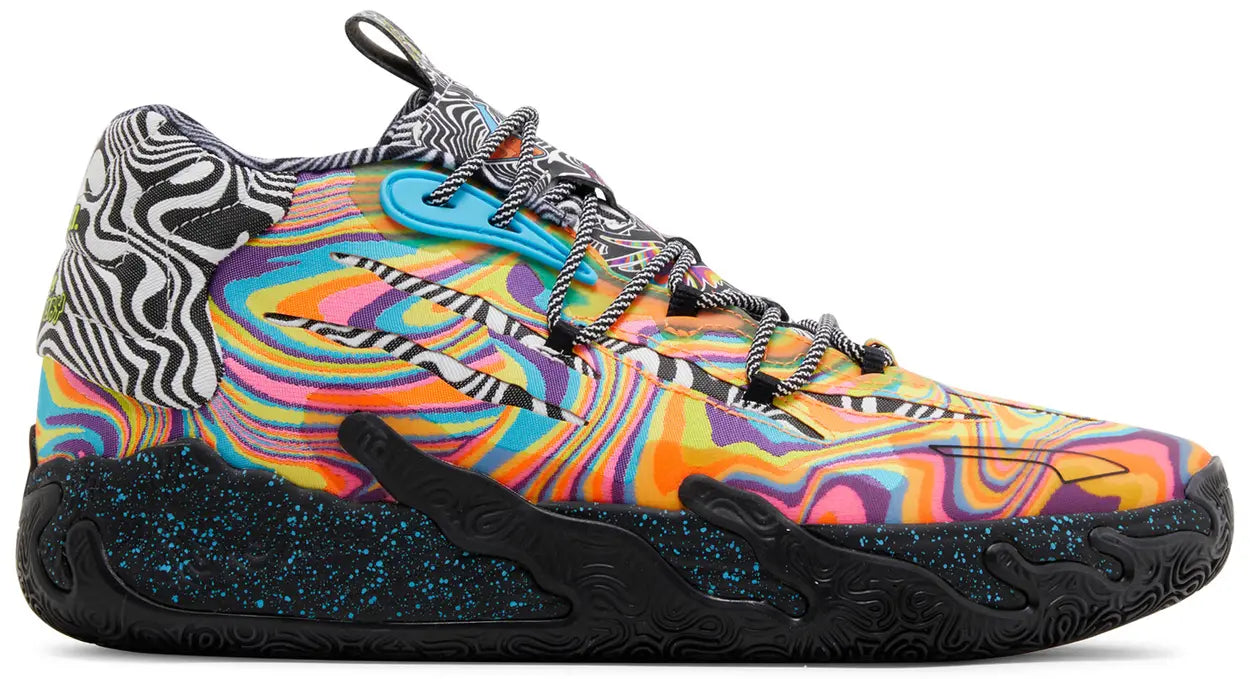 The Dexter’s Laboratory x PUMA MB.03 showcases a textile upper finished in a swirling blend of yellow, pink, turquoise and purple hues. The vibrant tones are contrasted by a psychedelic white and black print throughout the tongue, lining and heel, marked with ‘M.E.L.O’ and ‘Dexter’s Laboratory’ branding. Cartoon graphics on each tongue depict assorted beakers and flasks, while the interior side displays the likeness of Dexter and his sister Dee Dee. Lightweight cushioning is provided by a black NITROFOAM midsole, covered in speckled detailing and supported by a solid black rubber outsole.