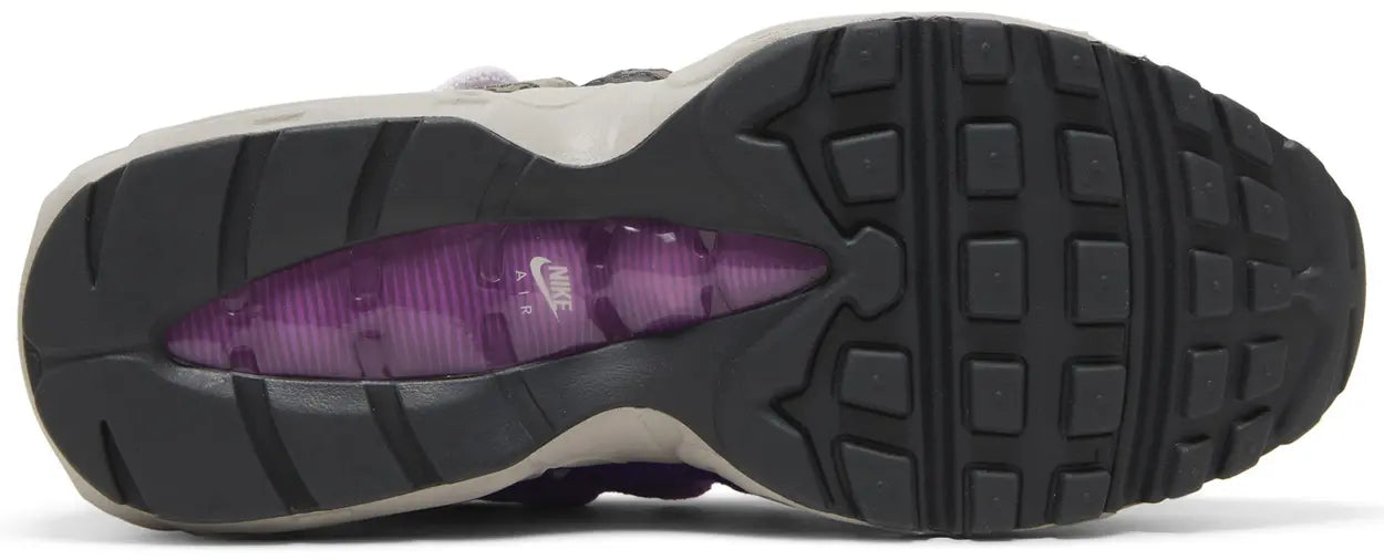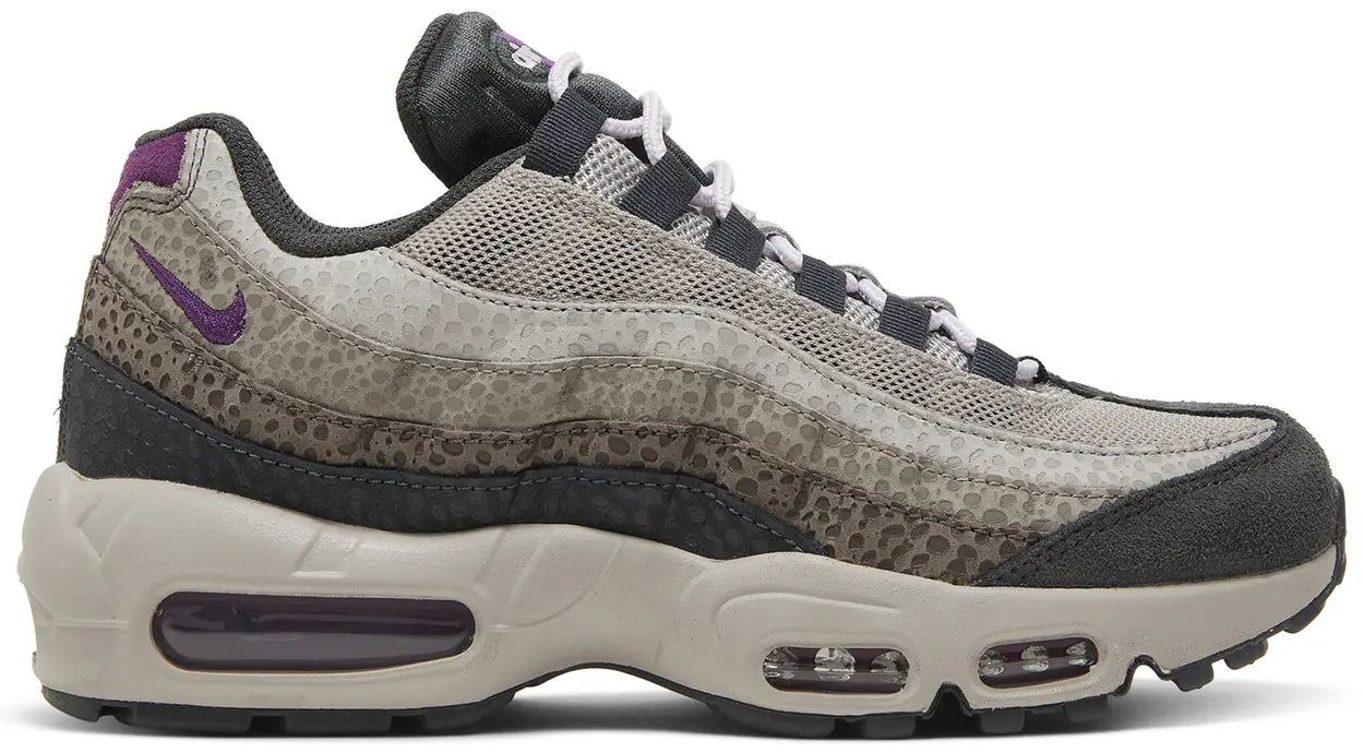 The Nike women’s Air Max 95 ‘Viotech’ brings together sharply contrasting hues with an eclectic mix of materials. On the lateral side, Nike’s iconic safari print is applied to wavy overlays in leather and suede, featuring gradient beige tones with a bottom layer in a neutral olive green hue. The opposite side showcases pink and violet overlays built with alternating layers of suede and corduroy. Lightweight cushioning arrives via a tan polyurethane midsole, enhanced with purple-tinged Air-sole units nestled in the forefoot and heel.