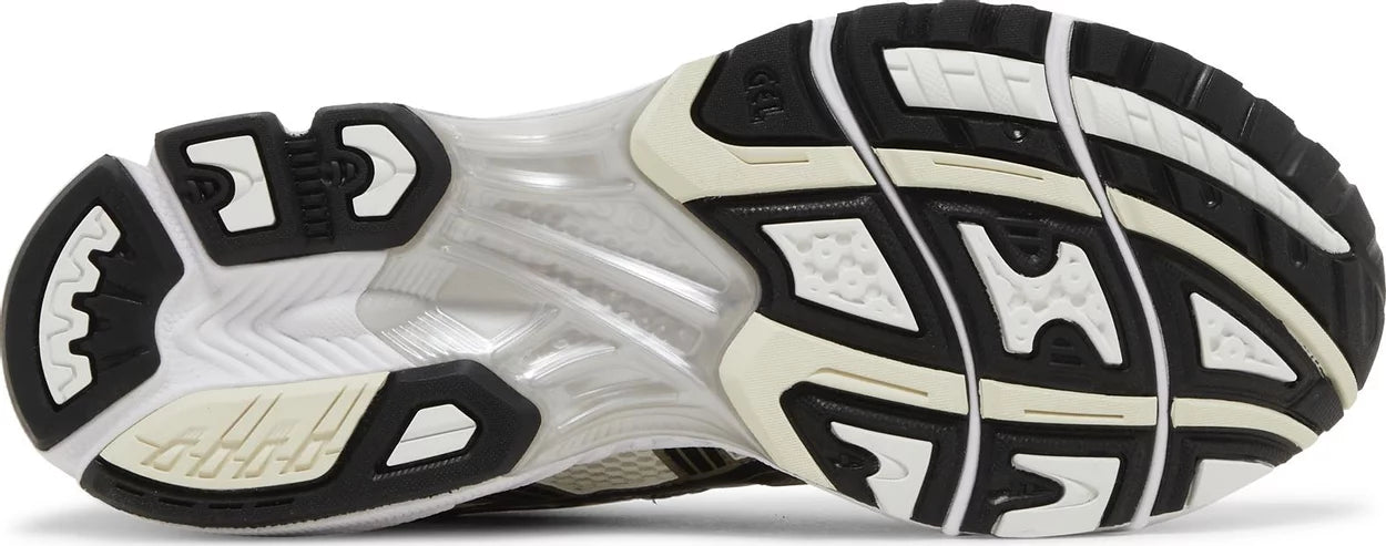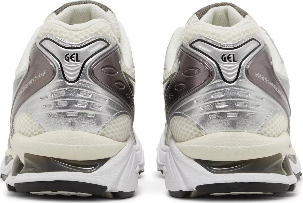 The ASICS Gel Kayano 14 ‘Silver Cream’ features a distinctive color scheme and build that distills a 2000s running-shoe aesthetic. Polished black side stripes decorate an off-white mesh upper, fortified with durable synthetic overlays in a gleaming metallic silver finish. The lifestyle runner rides on a lightweight EVA midsole with visible Gel cushioning in the forefoot and heel. Underfoot, the rubber outsole is fitted with ASICS Trusstic System, good for midfoot support and stability.