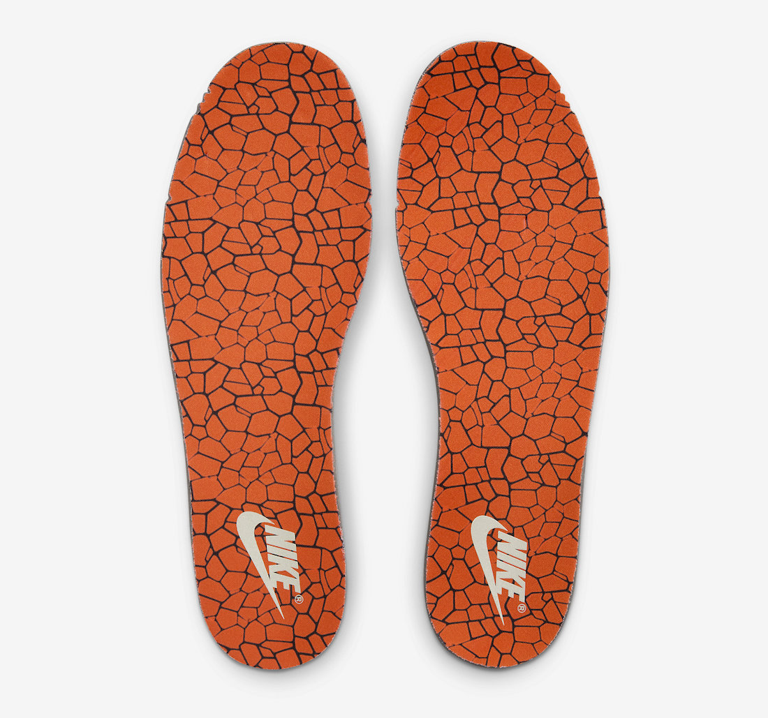 The Nike Dunk Low ‘Cracked Orange’ dons a tumbled leather upper in an off-white finish, contrasted by suede overlays in Total Orange. The vibrant hue is repeated on a Swoosh and Nike-branded back tab made with cracked leather detailing. Undergirding the sneaker is an orange-tinted translucent rubber outsole, featuring a traction pattern designed to grip the hardwood.