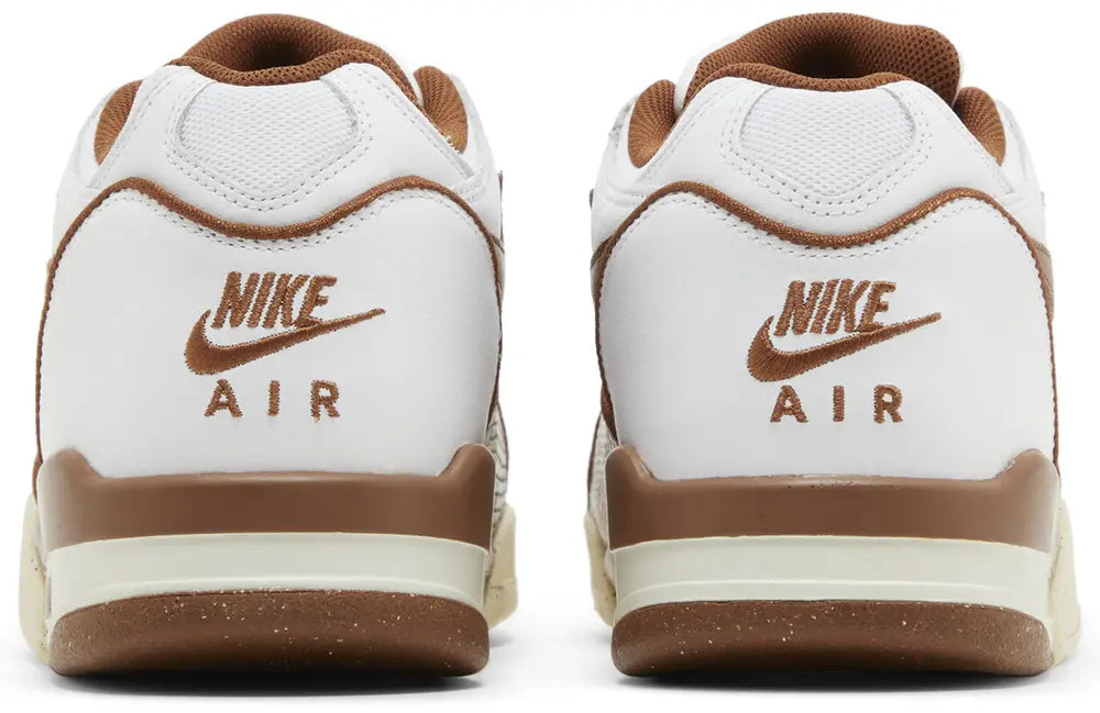 The Stussy x Nike Air Flight 89 Low SP ‘Pecan’ sports a white leather upper with contrasting brown accents on the signature Swoosh, molded eyelets and interior lining. Matching brown piping surrounds the heel and forefoot overlay, the latter finished in a faux snakeskin pattern. Unique branding elements include ‘Stussy Air’ embroidered on the tongue and Stussy’s ‘SS’ emblem on the lateral forefoot. Lightweight cushioning is provided by a polyurethane midsole, featuring a visible Air-sole unit in the heel.