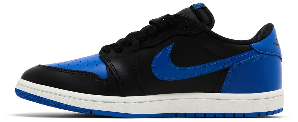 The Air Jordan 1 Retro Low '85 OG 'Royal' combines a black base with royal blue accents on the toe box, Swoosh, heel overlay and back tab, featuring the iconic Wings logo. A woven Nike Air tag graces the breathable nylon tongue. Modeled after the original 1985 release, the midsole comes replete with a vintage off-white and encapsulated Air-sole cushioning in the heel.