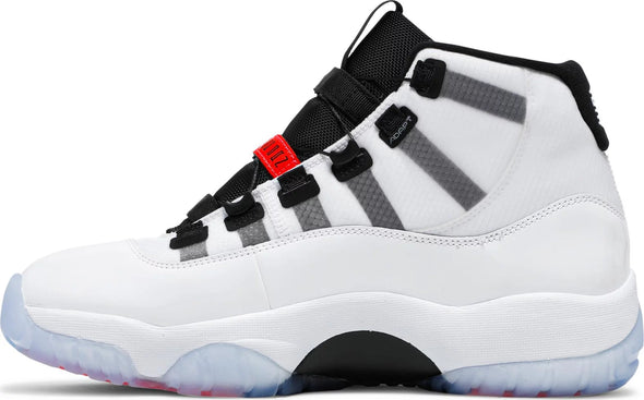 The Air Jordan 11 Adapt ‘White’ commemorates the iconic silhouette’s quarter-century milestone by updating the shoe with Nike’s groundbreaking power lacing technology. The design DNA of MJ’s fourth championship sneaker remain intact, highlighted by an upper that blends semi-translucent textile with a white patent leather overlay. The midsole houses luminescent Adapt buttons that control the Nike Adapt lace engine. Alternately, users can make adjustments through the Nike Adapt app, including changing the colors and flashing pattern of the buttons’ lights.