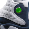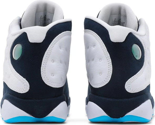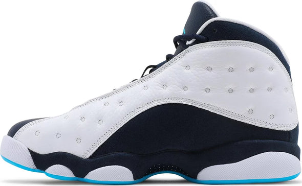The Air Jordan 13 Retro ‘Obsidian’ updates the vintage mid-top with a familiar color scheme, one that combines stitched tumbled white leather with contrasting navy blue paneling. A Jumpman icon in Dark Powder Blue is embroidered atop the tongue, while the 13’s holographic cat eye decorates the lateral ankle. Underfoot, the distinctive panther paw outsole features herringbone rubber traction pods and a carbon fiber shank plate for improved stability.