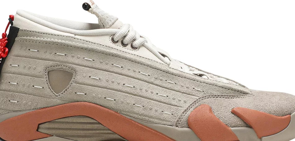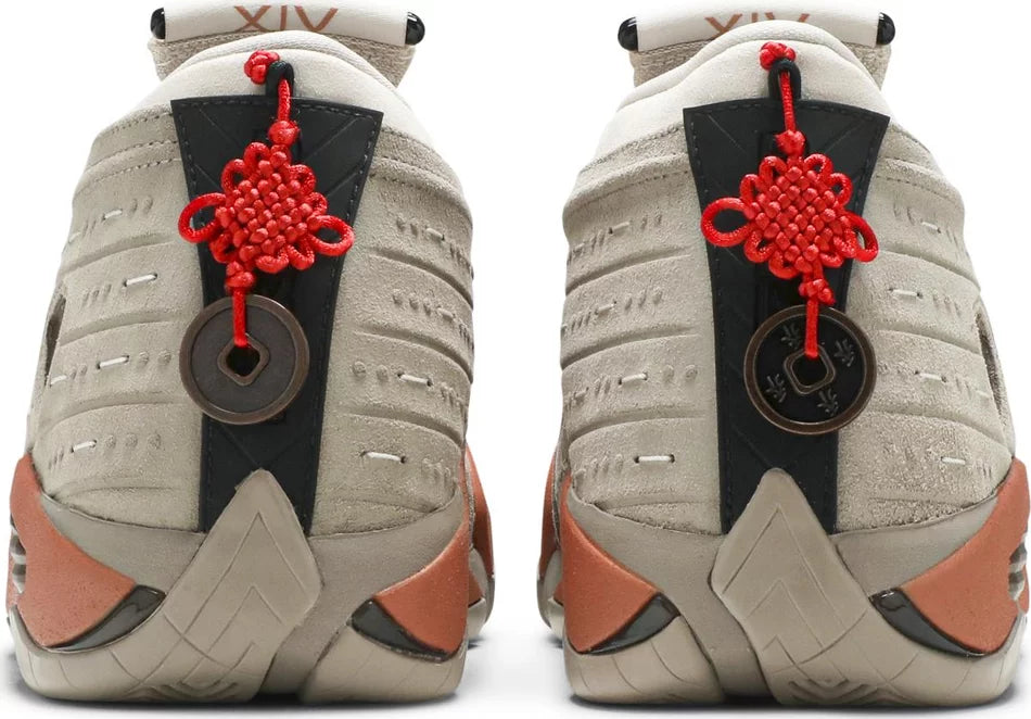 Developed in partnership with Edison Chen’s streetwear brand, the CLOT x Air Jordan 14 Retro Low ‘Terracotta’ is the follow-up effort to the Air Jordan 13 Low ‘Terracotta’ from 2018. Like its predecessor, the low-top features a tan suede upper with embossed detailing that mimics protective armor — a nod to the thousands of life-size clay soldiers buried alongside the first emperor of China. Mismatched Jordan and CLOT branding adorns the tongue, designed to mimic an unfurled ancient scroll. Hanging off the heel is red Chinese knot, the end of which is threaded through a coin that’s stamped with a Chinese idiom for prosperity and happiness.