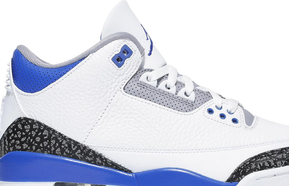 The Air Jordan 3 Retro ‘Racer Blue’ showcases OG-inspired color blocking that recalls the shoe’s ‘Fire Red’ colorway from 1988. The upper is crafted from white tumbled leather with vibrant royal blue detailing on the sneaker’s eyelets, collar and polyurethane midsole, featuring visible Air sole cushioning under the heel. Additional blue accents land on standard Jumpman branding hits at the tongue and heel. Dual elephant-print overlays are updated with a pronounced crackle pattern.
