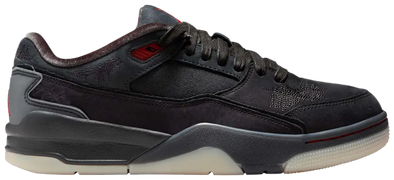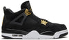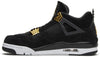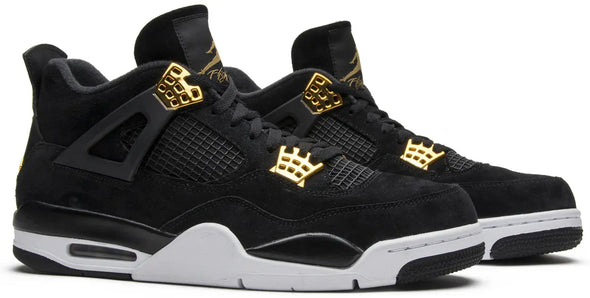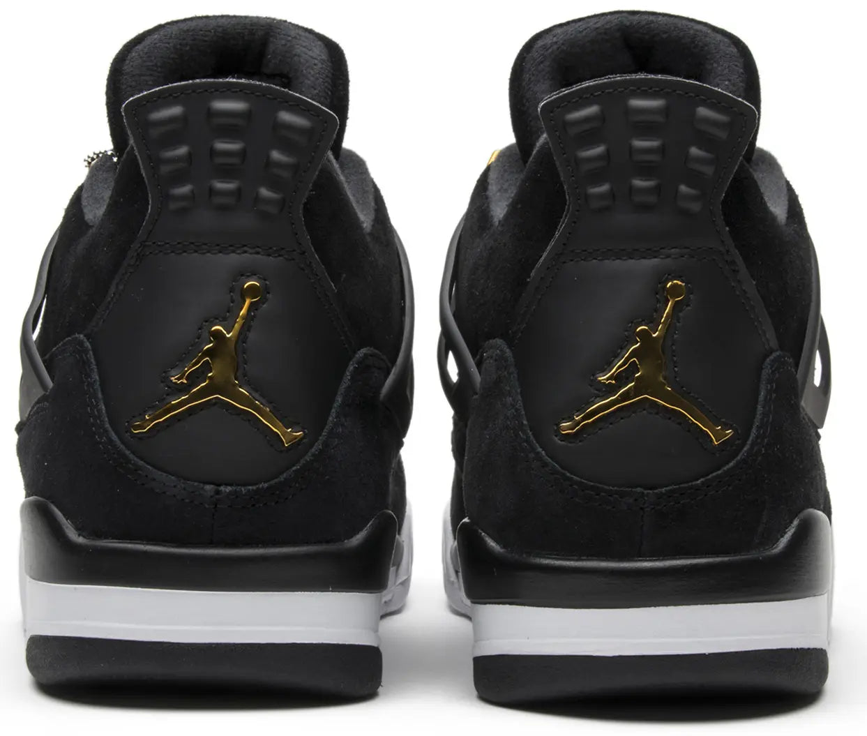 The Air Jordan 4 Retro ‘Royalty’ pairs a monochromatic black suede upper with contrasting metallic gold accents. They shine on the signature molded eyelets and a Jumpman icon on the synthetic leather heel panel. Additional Jumpman branding lands on the woven tongue tag and rubber outsole, featuring a traditional herringbone traction pattern for optimal grip. Lightweight cushioning is provided by a polyurethane midsole, enhanced with a visible Air sole unit under the heel.