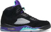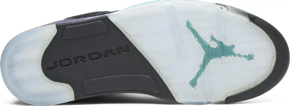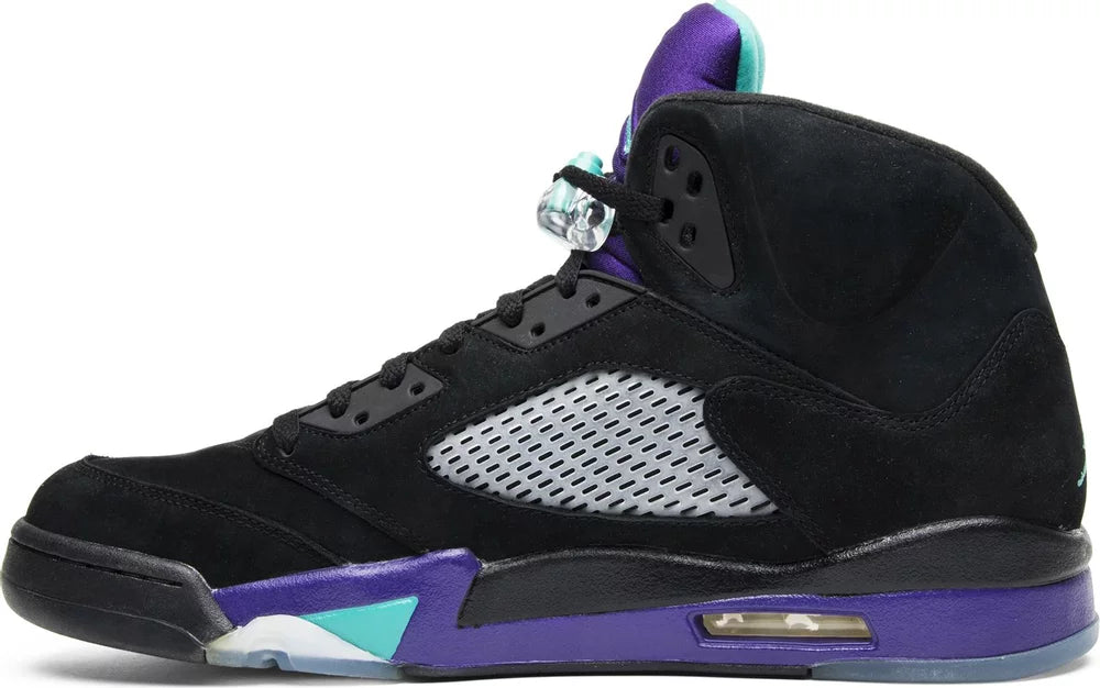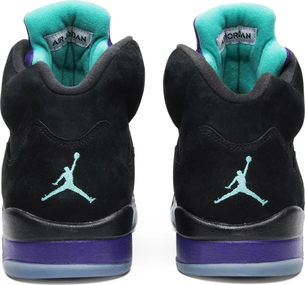 The Nike Air Jordan 5 Retro 'Black Grape' is an alternative black-based iteration of the classic 'Grape' colorway. The design features a black nubuck upper with New Emerald and Grape Ice accents. Released in June 2013, the sneaker also comes with an icy blue translucent outsole.