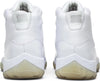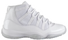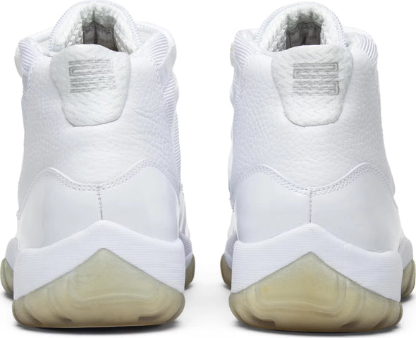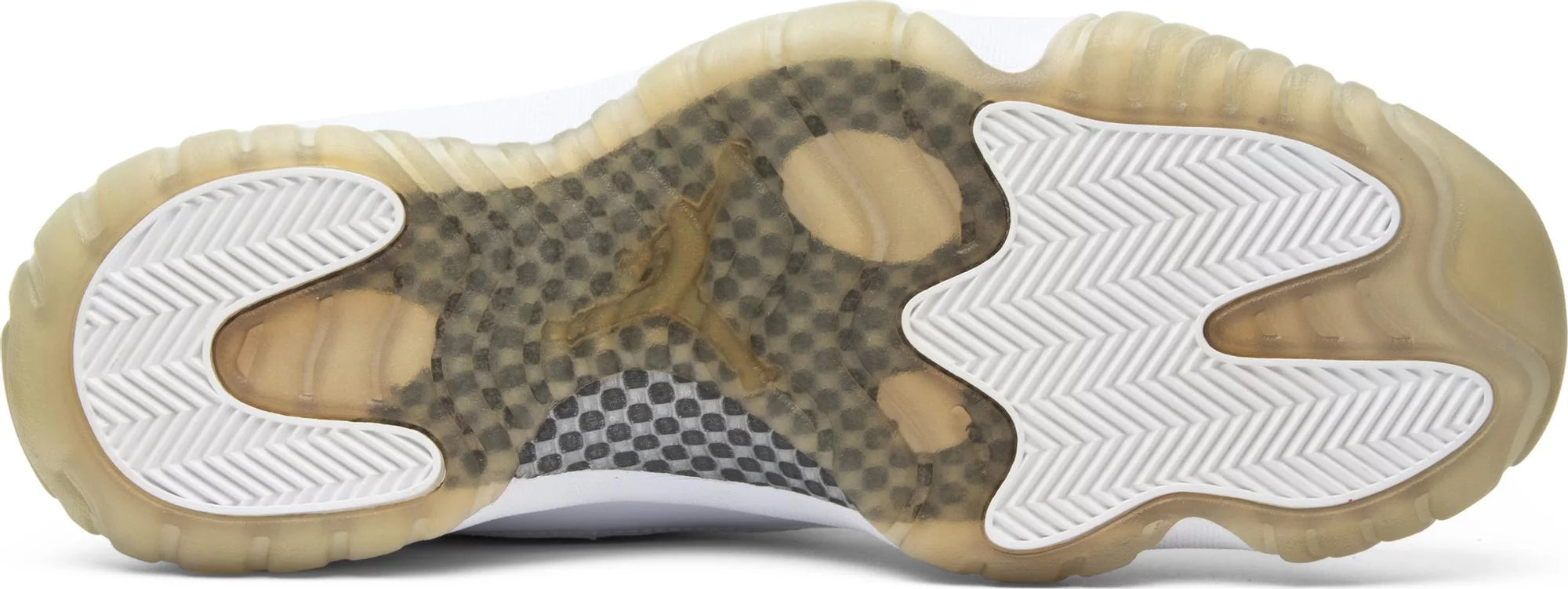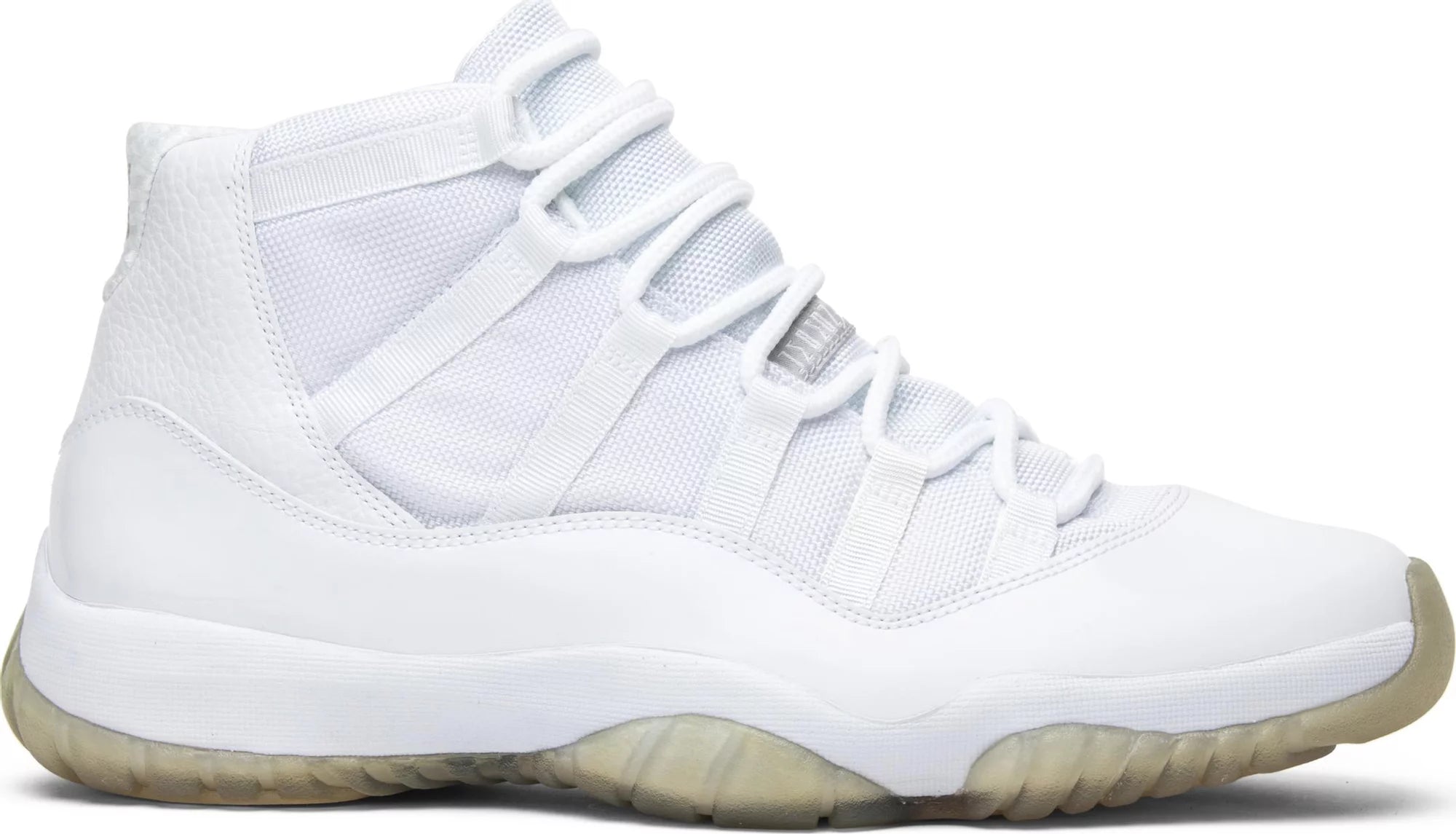 The Air Jordan 11 Retro ‘Silver Anniversary’ sneaker is part of a special May 2010 release celebrating Jordan Brand’s 25th Anniversary. Upon its release, controversy surrounded the Jordan 11 model in particular, as the Jumpman logo was intentionally missing from the collar. The sneaker’s crisp white and metallic silver leather upper is finished with tonal accents. At the bottom, the shoe's translucent outsole features a multidirectional traction pattern for grip.