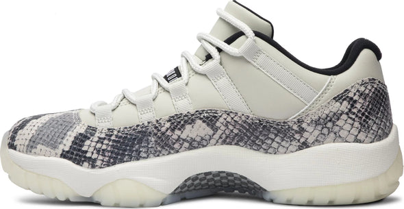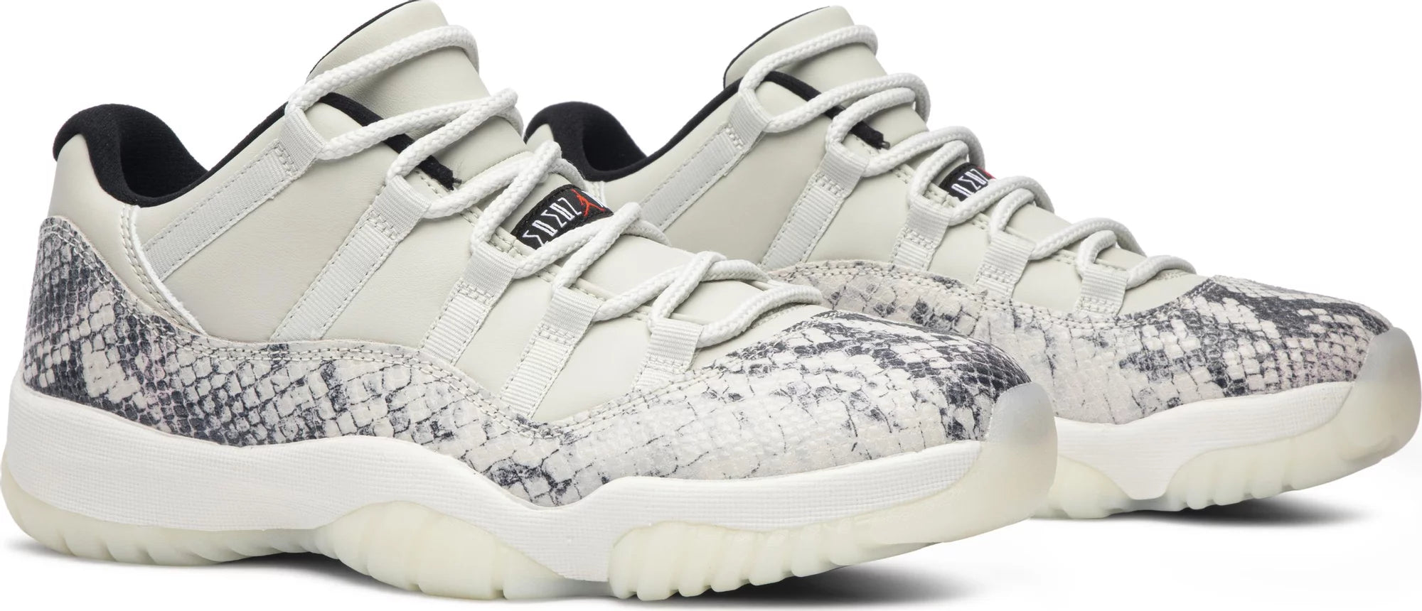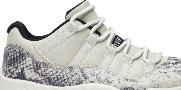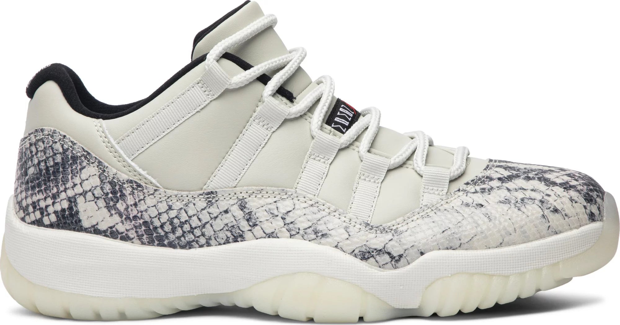 The Air Jordan 11 Retro Low's iconic identity was founded when Michael Jordan returned to the game in 1995. Surfacing in June 2019, this 'Light Bone Snakeskin' variant reaffirms the classic's allure with a contemporary snakeskin print on the leather upper's mudguard. Rope laces winding through the lateral webbing customize fit. Signature Jumpman insignias are positioned on the tongue and heel. A translucent rubber outsole and carbon fiber plate form the base.