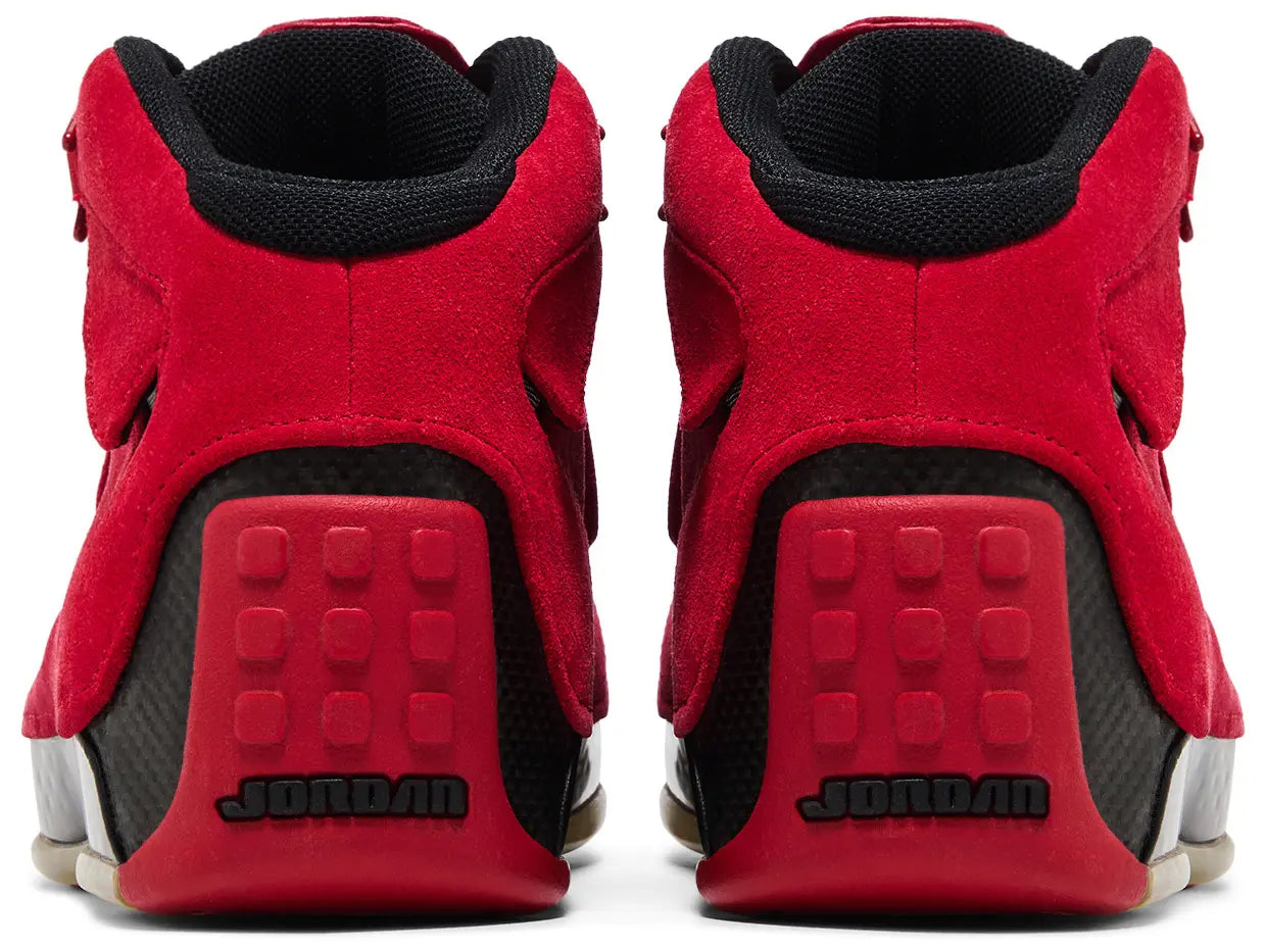 Representing the last shoe that Michael Jordan ever laced up on an NBA court, the Air Jordan 18 returned to stores in April 2018 in this ‘Toro’ colorway. The color palette suggests an alternate reality in which MJ retired in 2003 as a Chicago Bull, featuring a suede upper finished in University Red, contrasted by black accents on the branding elements and lining. Additional hits of black make their way to the midsole and heel wrap.