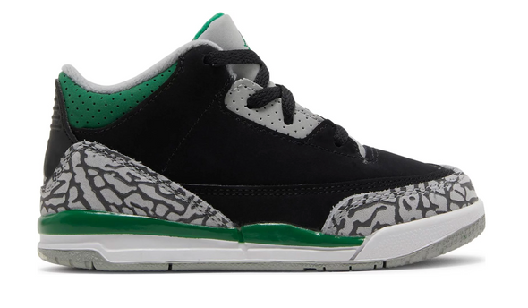The Air Jordan 3 Retro TD ‘Pine Green’ brings a refreshed colorway of the iconic silhouette to growing feet. The black nubuck upper is fortified with signature elephant print overlays at the forefoot and heel. Contrasting green accents land on the perforated collar, cushy foam midsole and the Jumpman logo embroidered on the tongue. Additional Jumpman branding hits decorate the sneaker’s back heel and foam insole. Underfoot, the solid rubber outsole features a circular traction pattern for reliable grip.